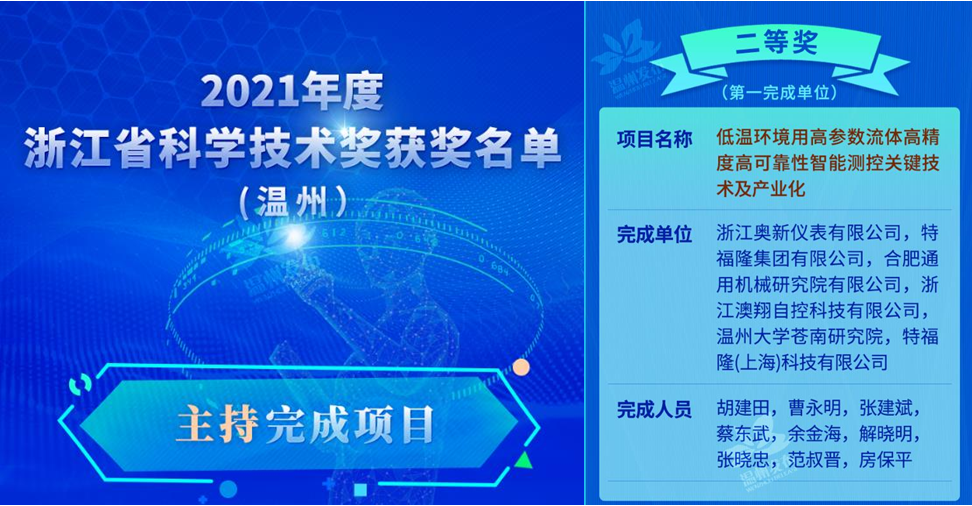 近日,浙江奥新仪表有限公司与LY体育·(国际)官方网站苍南研究院等单位合作的“低温环境用高参数流体高精度高可靠性智能测控关键技术及产业化”项目荣获浙江省科学技术进步奖二等奖。从2018年开始,LY体育·(国际)官方网站苍南研究院张淼教授领衔的智能仪器仪表技术团队与浙江奥新仪表有限公司开展深入合作,取得多项技术突破。此次获奖是LY体育·(国际)官方网站苍南研究院首次作为项目主要完成单位荣获的省级科学技术进步二等奖,标志着LY体育·(国际)官方网站苍南研究院产学研融合创新再上新台阶。
