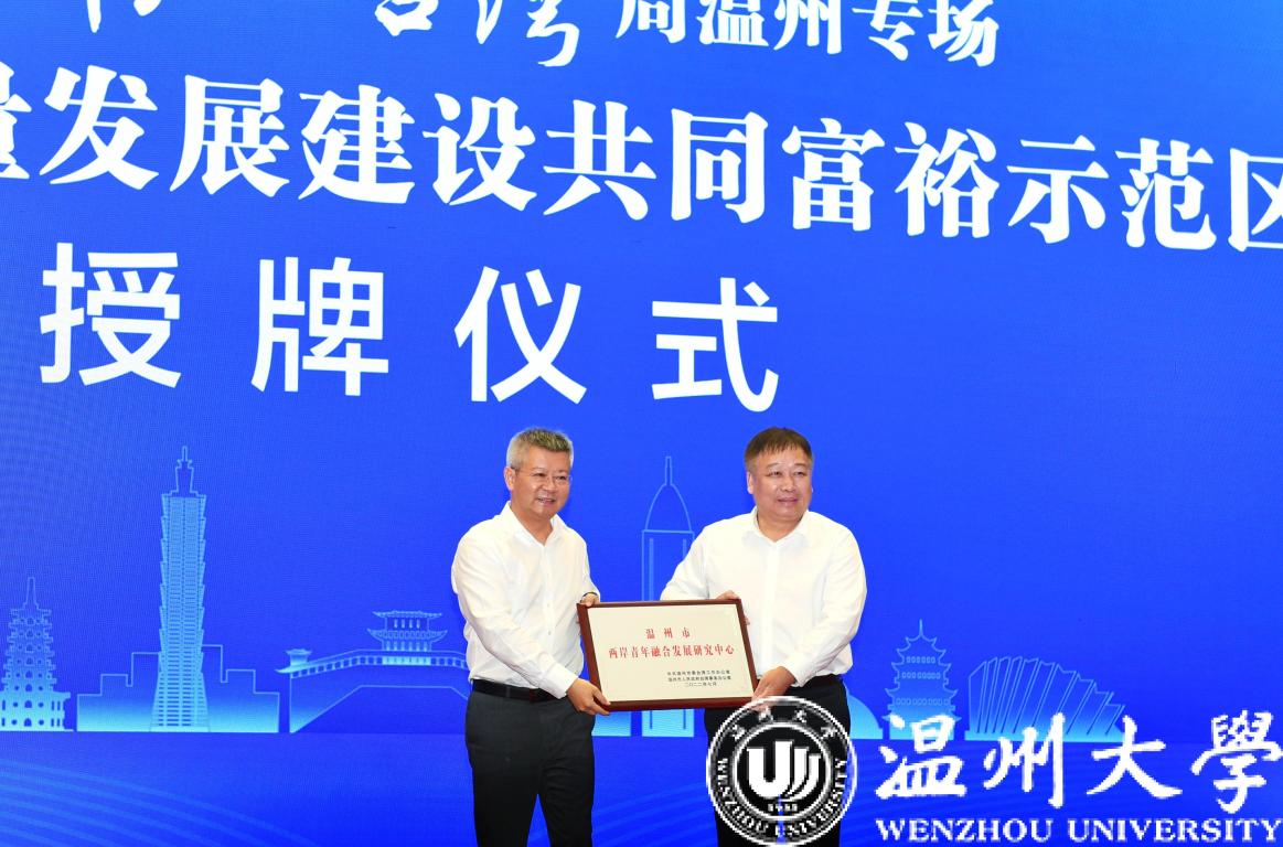 在“筑梦温州”海峡青年创新创业季启动仪式上,大会为LY体育·(国际)官方网站两岸青年融合发展研究中心授牌,校长赵敏校长从温州市委常委、统战部部长汪驰手中接牌。