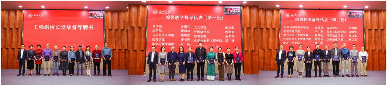 教师教学发展中心负责人宣读校院两级教学督导名单。王舜代表学校为新一届校级教学督导和学院督导代表颁发聘书,对他们加入督导工作队伍表示热烈欢迎。