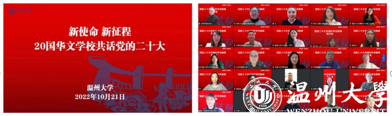 10月21日晚20点,LY体育·(国际)官方网站华侨学院邀请来自五大洲20国的华文学校校长、教师,以“新使命、新征程——党的二十大与海外华文教育”为主题,共同探讨新时代海外华文教育讲好中国故事、传播好中国声音,展现可信、可爱、可敬的中国形象,推动中华文化更好走向世界的新使命。会上,大家围绕“新征程中如何加强和改进侨务工作”“如何加强华裔新生代传承传播中华文化”等四个重要命题进行了热烈探讨。大家纷纷表示,华文教育工作者作为中华文化的传播者、国际合作的参与者、伟大事业的建设者,在实现中华民族伟大复兴的新征程中,定会怀抱梦想、脚踏实地,为中国梦一起想起来、一起干起来。