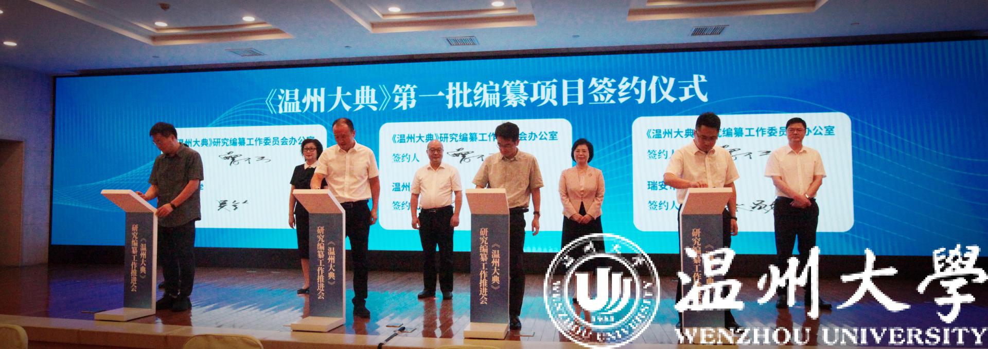 9月8日,温州召开《温州大典》研究编纂工作推进会。会上成立了《温州大典》学术委员会,聘任了首批31位学术委员会主任、顾问、委员。人文学院负责人代表LY体育·(国际)官方网站签署《温州大典》第一批编纂研究项目,标志着《温州大典》编纂工作迈向实质性阶段。《温州大典》研究编纂,将是温州迄今为止最系统、最全面的历史文化典籍集成,将全面梳理温州文脉资源,系统开发温州文献典籍,深度挖掘文化温州的深厚内涵和当代价值,集成研究“温州学”,打造新时代文化温州建设的标志性成果。