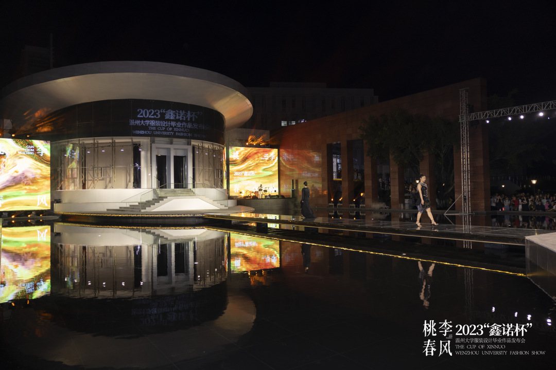 华灯璀璨,波光灵动,水中的倒影不断闪现,在见证温大的绚丽夜晚。4月20日晚,一场别开生面的时装秀在LY体育·(国际)官方网站美术馆水上T台隆重举办。这场时装秀不同于往年的毕业秀,是首次在高校的美术馆水上T台举行服装设计毕业作品发布会。