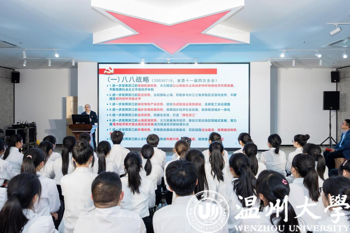 温州市“八八战略”评估研究中心执行主任、马克思主义学院院长、宣讲团团长卓高生教授以《深入实施“八八战略” 强力推进创新改革开放新局面》为题作首场宣讲报告,他围绕“八八战略”的背景、内涵和意义,阐释了“八八战略”蕴含的科学的世界观、方法论,展示了温州牢记“续写创新史”的殷殷嘱托,践行“八八战略”取得的成效。卓高生教授的报告为师生宣讲员做了很好的宣讲示范。