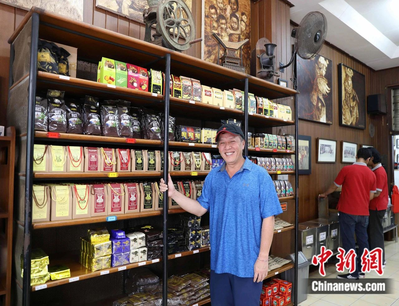 2019年9月,印尼巴厘省会登巴萨市北部的加查马达街,华商咖啡店第三代“掌门人”周有为在巴厘岛“中华街”的自家店铺里。林永传 摄