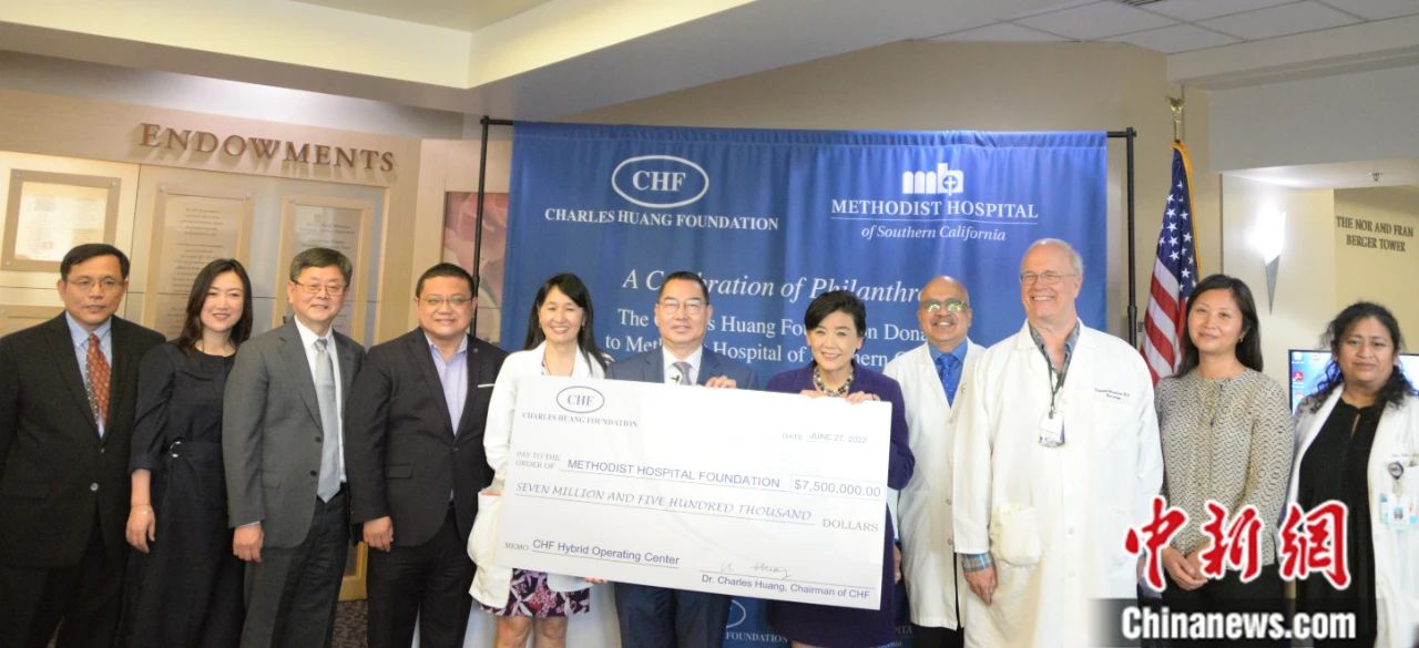 2022年6月,美国旧金山,华商黄春华(右三)向旧金山东华医院捐赠700万美元。刘关关 摄