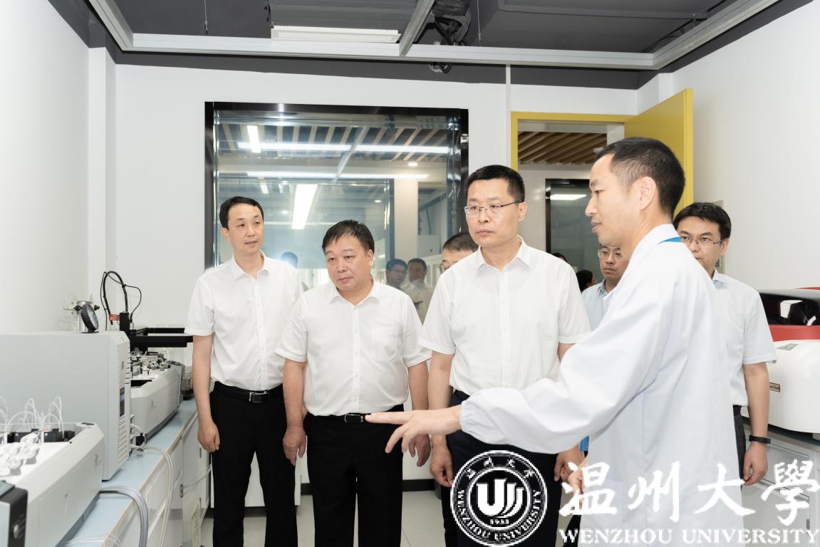 卢山一行来到我校生命与环境科学学院,张健、赵敏介绍学校建设发展情况,并重点介绍了我校浙江省优势特色学科生态学、城镇水污染生态治理技术国家地方联合工程研究中心等学科、平台建设情况以及人才队伍、科学研究和社会服务成果,特别是“温大碧晟号”助力攻克大型湖泊蓝藻水华世界难题、“景观式高浓度黑水多级生物处理”等技术应用于杭州西湖三潭印月景区水治理取得的卓越成效。卢山一行还来到我校化学与材料工程学院,参观了制笔实验室、分析实验室和有机实验室,了解碳+能源、钠离子电池、碳纳米材料等团队、由化学学科创办的中国高起点国际新刊Carbon Energy,以及人才培养、科技创新、赋能产业取得的丰硕成果。