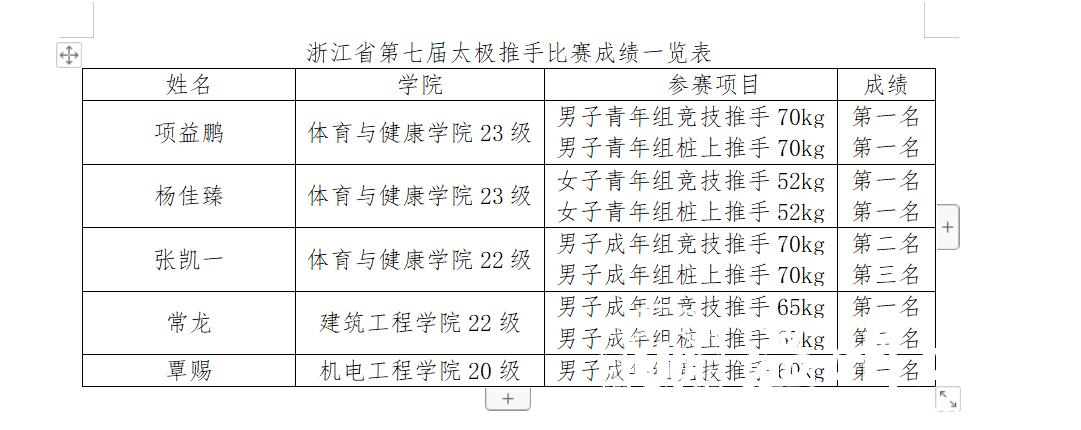 8月4日至6日,浙江省第七届太极推手比赛在乐清市新体中心体育馆隆重举行。我校武术队锚定目标、全力以赴,获得6金2银1铜的好成绩,2名教练员荣获“优秀教练员”称号,1名运动员荣获“优秀运动员”称号。