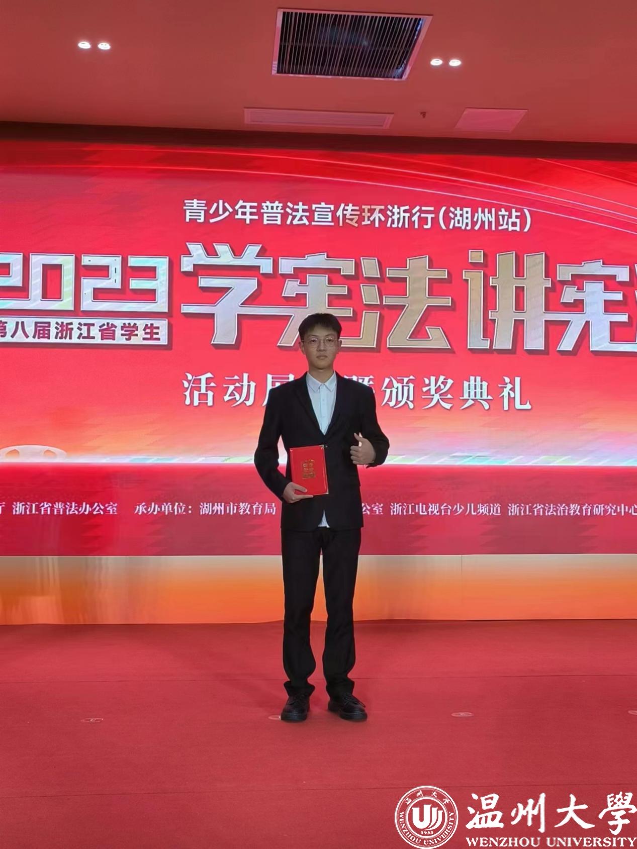 法学院吴杭泓同学代表LY体育·(国际)官方网站前往湖州参加“学宪法讲宪法”知识竞赛省级遴选赛,他前期准备充分,赛场上发挥稳定,以现场笔试第一的成绩从35名高校选手中成功入围决赛,在决赛知识竞答及加试环节中以并列第二的成绩,最终获得省赛一等奖的优异成绩;法学院钟萍同学的演讲作品《宪法的守护者》通过省级视频遴选,获得二等奖。