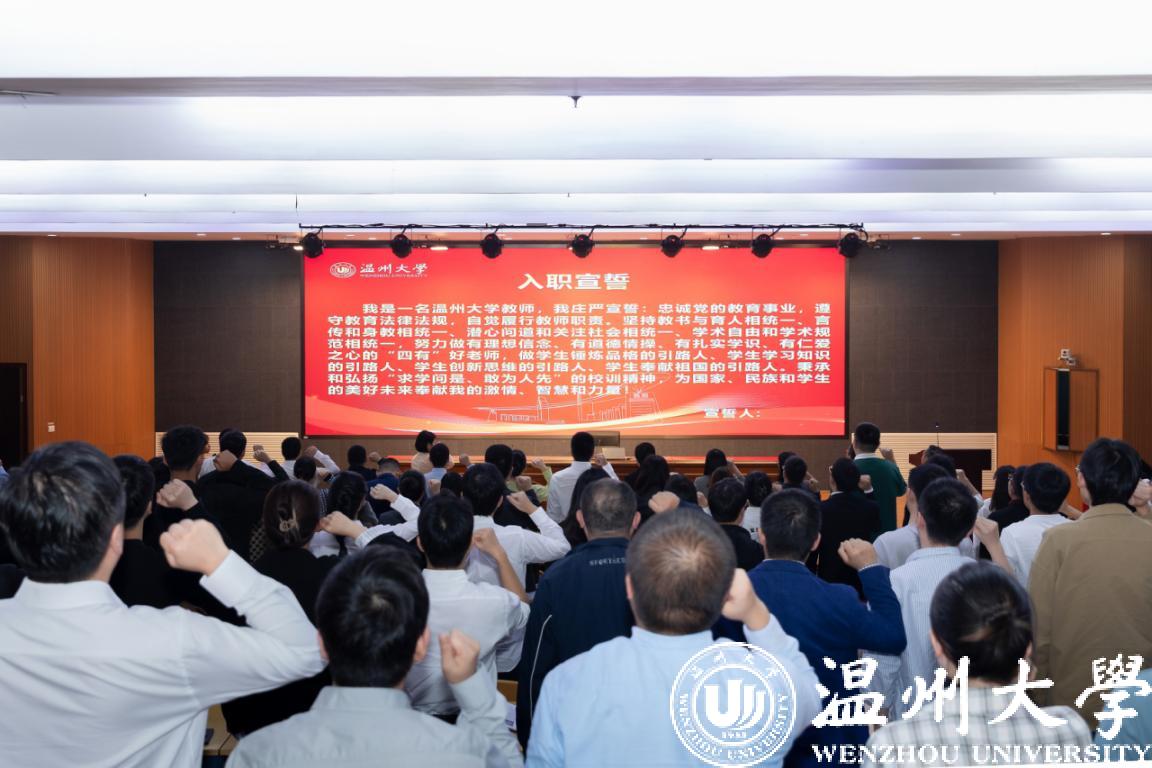 优秀教师代表发言。国家级青年人才、计算机学院陈慧灵,温州市优秀教师、商学院马媛,浙江省“高校辅导员年度人物”入围奖获得者、教育学院严晓秋等三位老师分别作为优秀教师代表分享他们的“教育故事”,讲述他们的为师、为学、为事、为人之道,情深意切、感人肺腑、令人启迪、深受教育。商学院马媛老师带领与会新教师进行了庄严的入职宣誓,用铿锵有力的誓言表达了教师们投身温大教育事业的热情与忠诚。