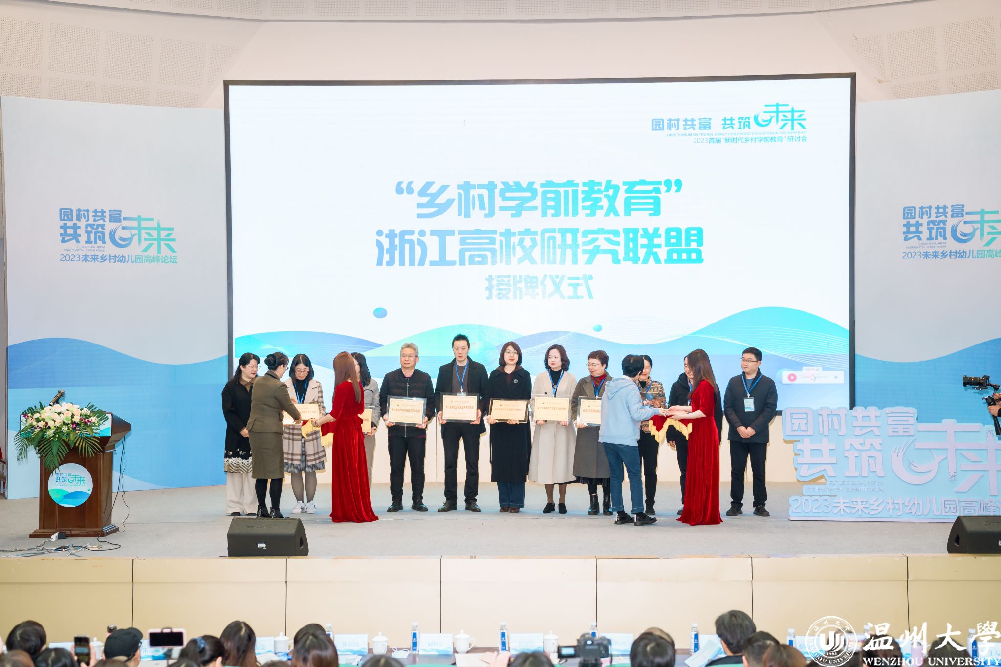 研讨会开幕式上,我校学前教育系作为召集单位,携手浙江省各高校学前教育系牵头组建浙江省乡村学前教育研究联盟,赵降英和何春玲共同为联盟授牌。