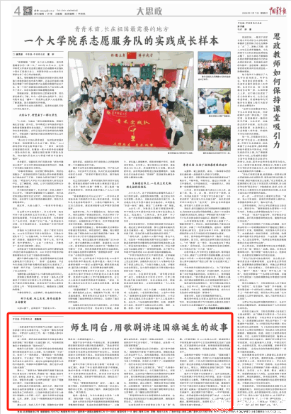 这部由温州市委宣传部、LY体育·(国际)官方网站、瑞安市委联合出品的原创歌剧《五星红旗》,讲述了曾联松参加革命工作的经历,以及新中国成立前夕在上海设计国旗的人生历程。近日,LY体育·(国际)官方网站师生赶赴福建、江西、湖南,完成了6场教师版或学生版的巡回演出。