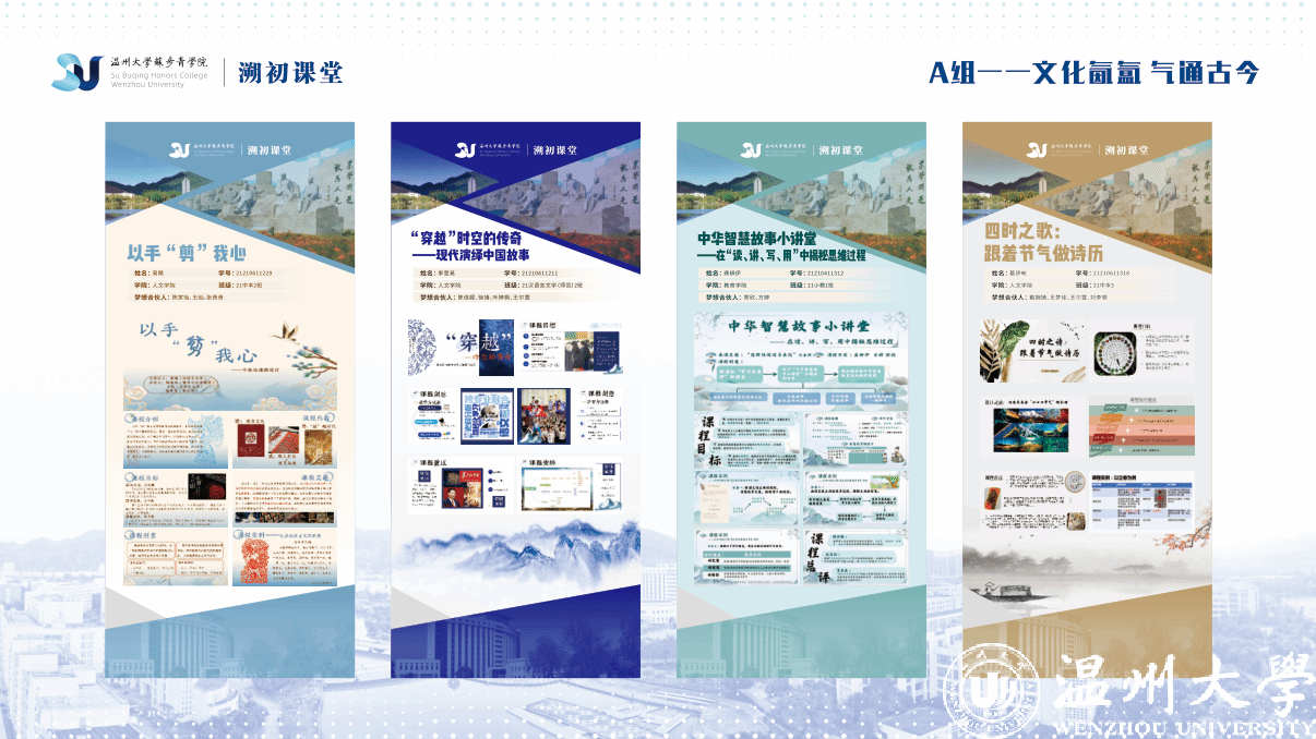 近日,LY体育·(国际)官方网站苏步青学院举办了一场个性化课程展,将中华传统文化与马克思主义相结合,与现代社会相结合,将多样态思政元素、多维度文化知识融合在课程设计中,从“文化氤氲气吞古今”到“自然变换妙手本心”再到“科技创新百感交融”,使个性化翩跹于课堂展示的画卷之上,让素养教育与知识性学习碰撞出不一样的火花,培养学生对中华传统文化的兴趣和热爱,在潜移默化中增强学生的文化自信。