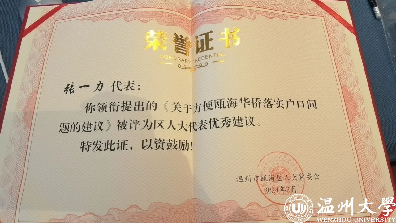 另外,张一力教授领衔提出的《关于方便瓯海华侨落实户口问题的建议》被评为瓯海区人大代表优秀建议。