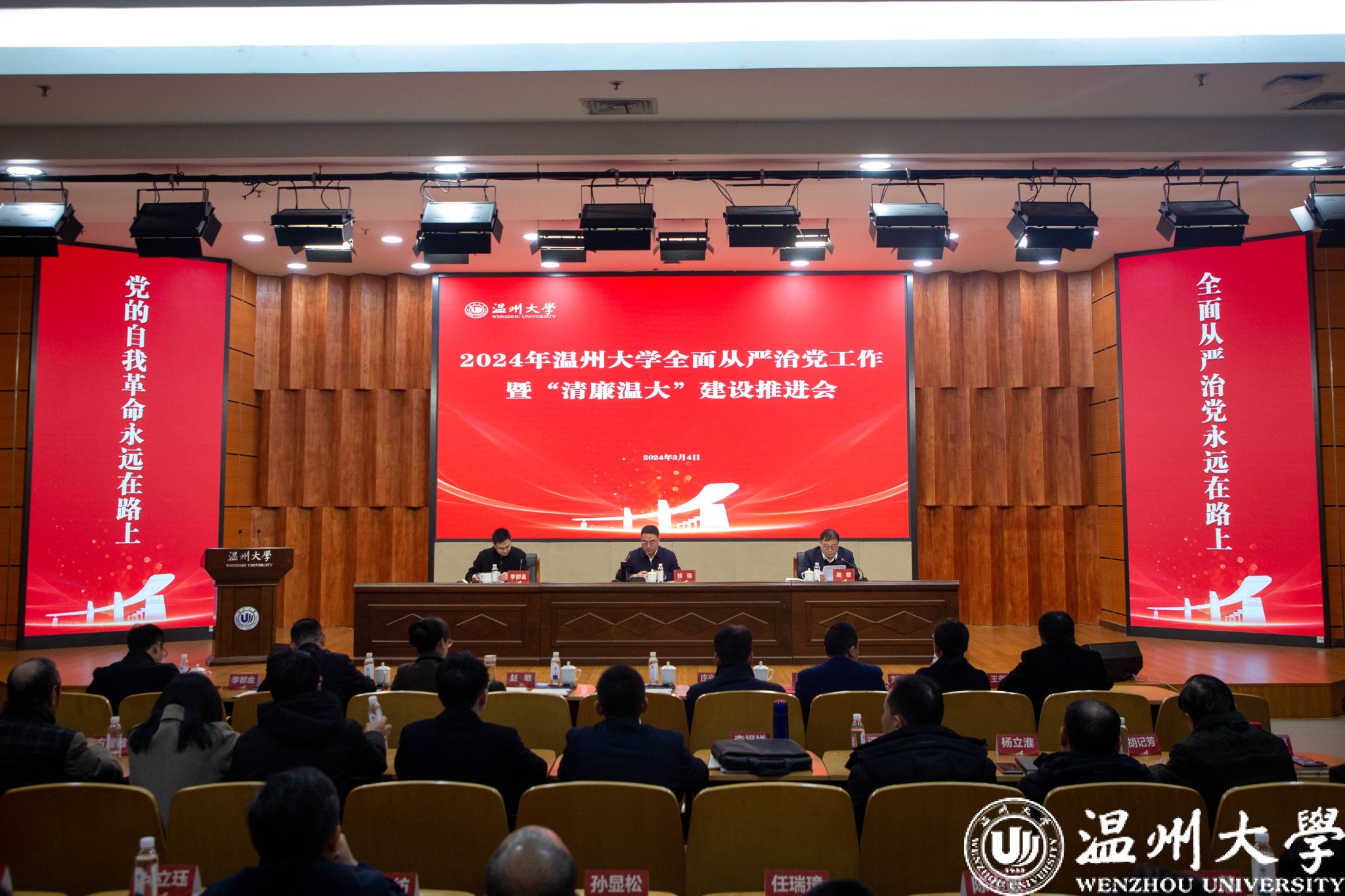3月4日下午,我校召开2024年全面从严治党暨“清廉温大”建设推进会,深入学习贯彻习近平总书记关于党的自我革命的重要思想,落实二十届中央纪委三次全会、省市纪委全会和全省教育系统全面从严治党暨清廉学校建设推进会部署要求。校党委书记钱强出席会议并讲话,校长赵敏主持会议。校党委委员、纪委书记,省监委驻LY体育·(国际)官方网站监察专员李都金部署2024年党风廉政建设工作。全体校领导、校纪委委员,全体中层干部,各学院、机关纪委书记,党总支、直属党支部纪检委员,纪检监察室(巡察办)全体人员参加会议。