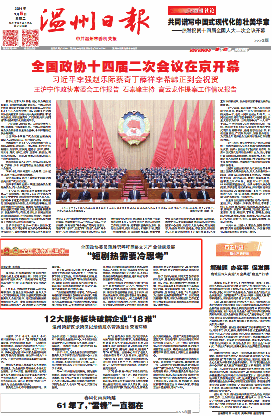 3月4日,全国政协十四届二次会议开幕当天,住温全国政协委员、LY体育·(国际)官方网站人文学院研究员、网络文创研究院院长蒋胜男向大会提交提案,建议加强短视频精品创作服务,进一步提升微短剧等网络作品质量与创作水平,推动网络文艺产业健康发展。