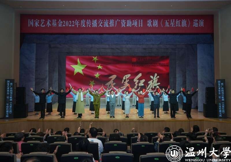 据介绍,《五星红旗》是国内首部以国旗为题材的歌剧,由温州市委宣传部、LY体育·(国际)官方网站、瑞安市委联合出品,精心创排。歌剧围绕中华人民共和国国旗设计者、LY体育·(国际)官方网站校友曾联松先生参加革命工作的经历以及新中国成立前夕在上海设计国旗的人生历程,描绘了温州人民在中国共产党的领导下,为争取民族独立、人民解放而书写的壮丽篇章。自2019年国庆节在温州大剧院首演以来,先后在浙江、山东、福建、江西、湖南等地巡演14场,好评如潮。