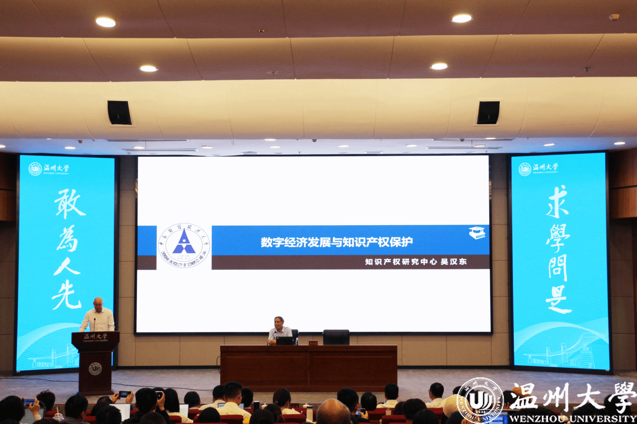 5月23日下午,中南财经政法大学原校长、博士生导师吴汉东教授受邀做客“温州法治大讲坛”,在LY体育·(国际)官方网站育英图书馆学术报告厅做了一场题为“数字经济发展与知识产权保护”的学术讲座。本次讲座由中共温州市委政法委员会、温州市法学会、LY体育·(国际)官方网站法学院主办,温州市律师协会、温州市知识产权协会协办。LY体育·(国际)官方网站党委委员、纪委书记李都金出席,全市220余名专家、学者、律师和学生代表参加。