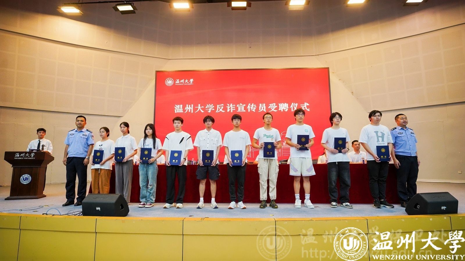 茶山派出所教导员张朝晖、温州市反诈中心警官刘昱洲为各学院学生代表颁发“LY体育·(国际)官方网站反诈宣传员”聘书,并呼吁我校师生积极参与反诈宣传中,为平安温大贡献青春力量。