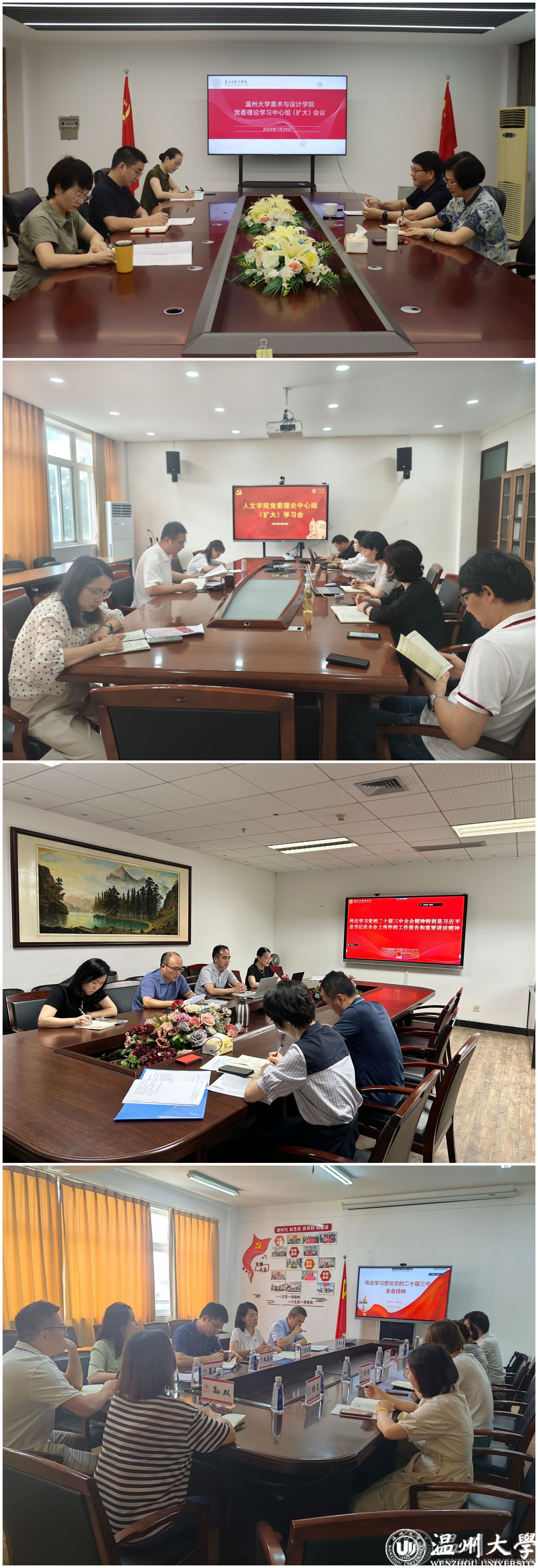 7月底前,学校各二级党组织和各党支部深入学习贯彻党的二十届三中全会精神,马克思主义学院、商学院、美术与设计学院、人文学院、电气与电子工程学院等二级学院相继召开党委理论学习中心组(扩大)学习会,通过线上线下学、集体交流研讨学等方式,第一时间传达学习全会精神,认真落实校党委理论学习中心组(扩大)学习会部署精神。聚焦关键问题,将党的二十届三中全会精神与党建、管理、育人等工作相结合,将全面贯彻落实全会精神与推动学校年度重点项目和近期重点工作一体贯通,全校上下营造了学习贯彻全会精神的浓厚氛围。商学院院长罗建利认为,要以二十届三中全会的召开为契机,依托温州民营经济发源地的地域特色,坚定改革信心、凝聚改革共识,切实把党的二十届三中全会精神贯彻落实到学院学科建设、专业建设、内设机构改革的工作中,努力提升学院的治理能力和治理水平。建筑工程学院季家毅同学认为,作为新时代大学生,面对全会所提及的“专精特新”,更应提升专业素养,学习新兴技能,坚决扛起党交给青年人的使命任务,做坚定的举旗者、忠诚的捍卫者、发展的推动者。
