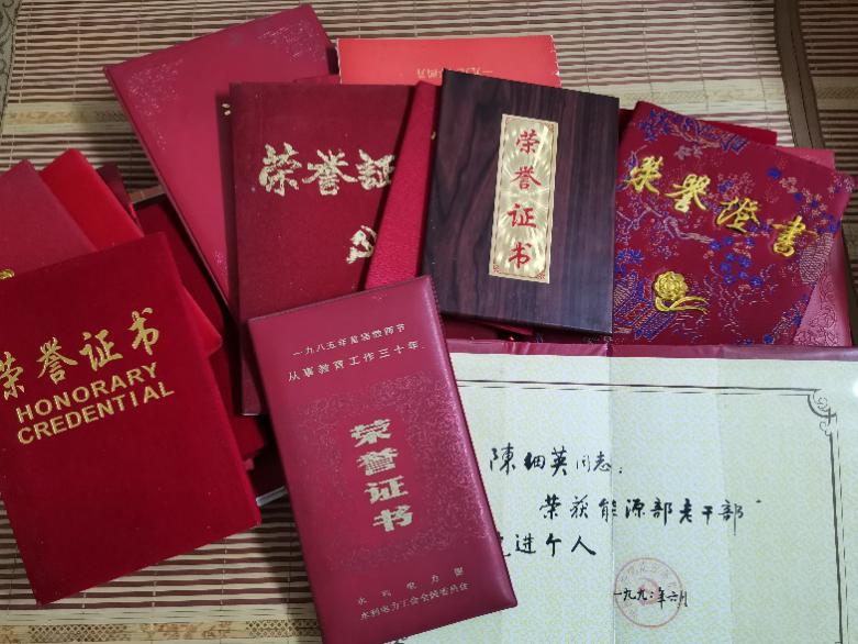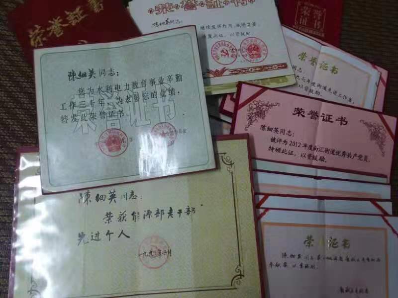 翻看陈细英的荣誉证书,其中有:先进工作者,关心下一代积极分子,城管奉献者,优秀共产党员等等。其中一本荣誉证书是2000年3月鹿城区老龄委颁发给陈细英的老有所为奉献奖。当子女翻看这些荣誉时,陈细英说:我从没有为追求荣誉和奖励做过一件事,无论我做什么工作都是遵循内心的信念和善念,大家把奖励和荣誉给与我,很让我感动,也很受鼓舞,不管是六十岁八十岁九十岁,只要有人需要,我愿意为社会再多做一些事。