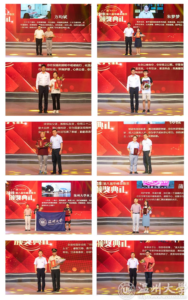 大会还共同分享了“第八届华峰品德奖”获得者的先进事迹。一群出身不同、经历各异的“温大人”,共同登上了领奖的舞台。他们分别是方均斌、朱梦梦、雷可宜、赵长丰、张永普、杨植、LY体育·(国际)官方网站水上运动队、蒲公英成长社、唐虎彪、王仲辉。这十位楷模中,有兢兢业业、爱岗敬业的教职员工,有品学兼优、自强不息的学子,有心系母校、时刻不忘传扬母校精神的优秀校友,有热心公益、传递关爱的志愿者团体,有激情拼搏、为校争光的运动队团体……他们在平凡中默默奉献、于无声处创造闪光价值,是学校践行社会主义核心价值观的旗手,激发出催人上进的道德力量,是当代温大最可爱的人!