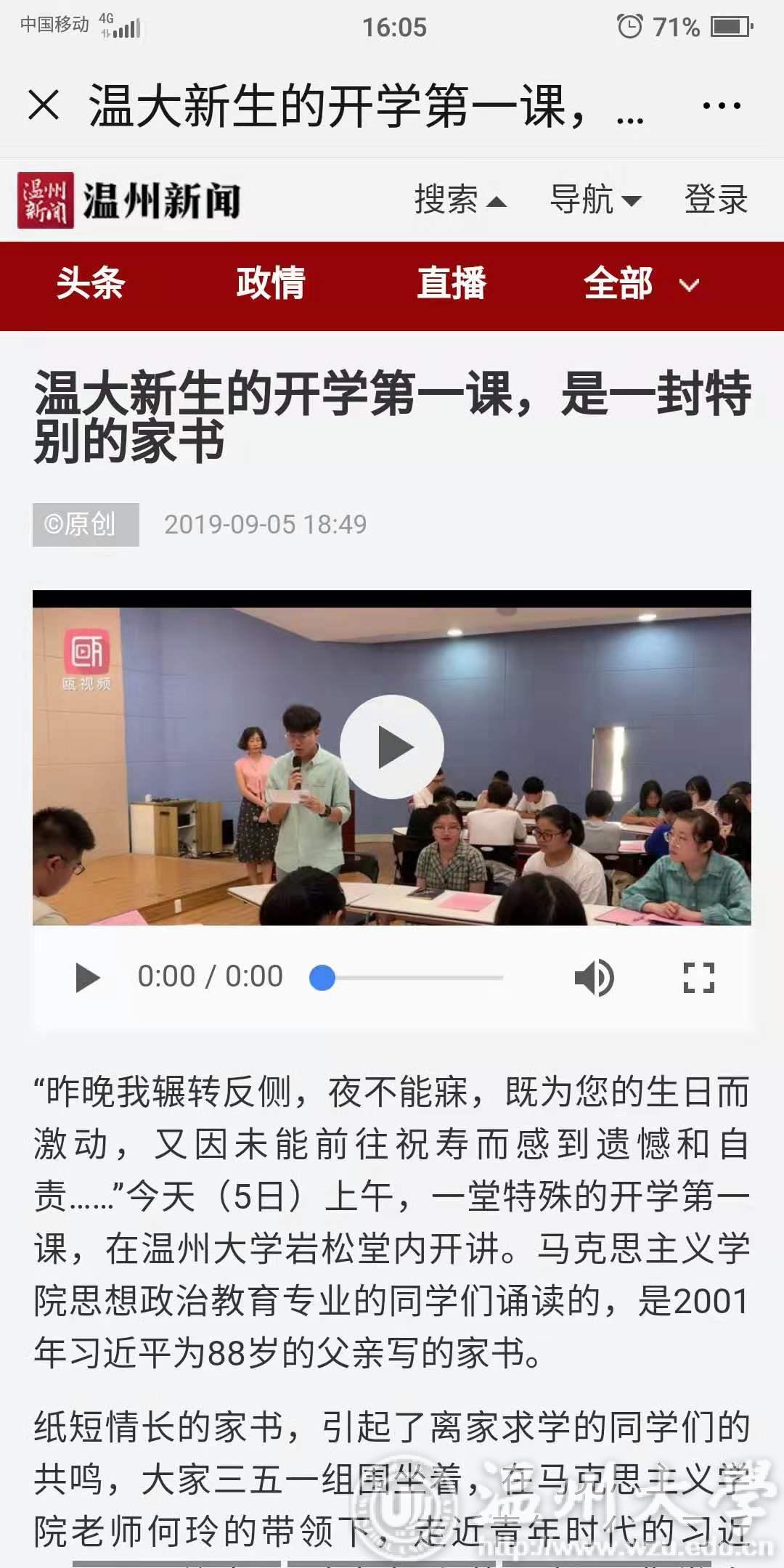 学习强国、温州新闻、温州日报还聚焦有风景的思政课,对我校新生思政课“一封特别的家书”进行了深入报道。