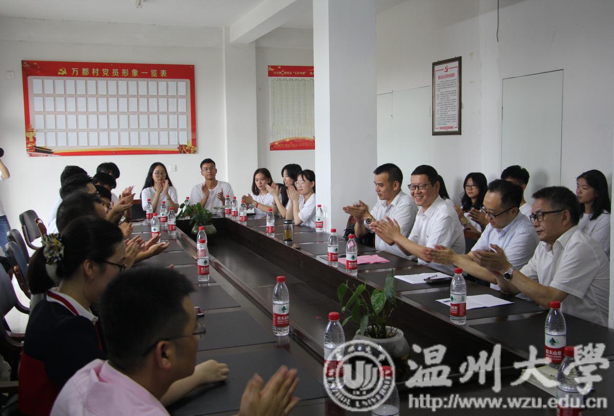 7月12日,校党委委员、组织部部长郑信军一行来到平阳县万全镇冯宅村看望慰问商学院“青春相冯暑期社会实践队”。在座谈会上,郑部长希望队员们能有“反思意识、品牌意识、安全意识、双赢意识”,并鼓励队员们要增强社会责任感,发挥地缘优势、发挥学校特色、发挥专业特长,把暑期实践活动与助推两区建设、助力乡村振兴等中心工作结合起来。
