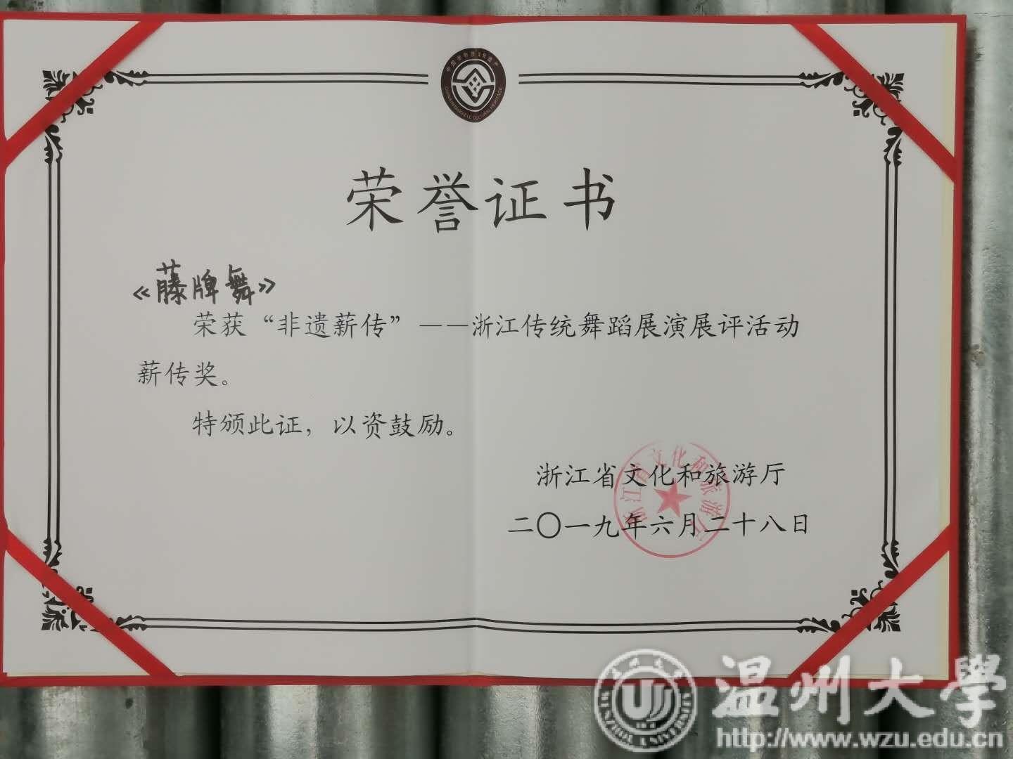 6月26—28日,浙江省“非遗薪传”舞蹈专场竞演活动在丽水景宁畲族自治县进行,由我校体育学院和团委共建的藤牌舞俱乐部由周义义副教授带队参加此次比赛,获得了团体最高分和大会最高奖项“非遗薪传奖”。
