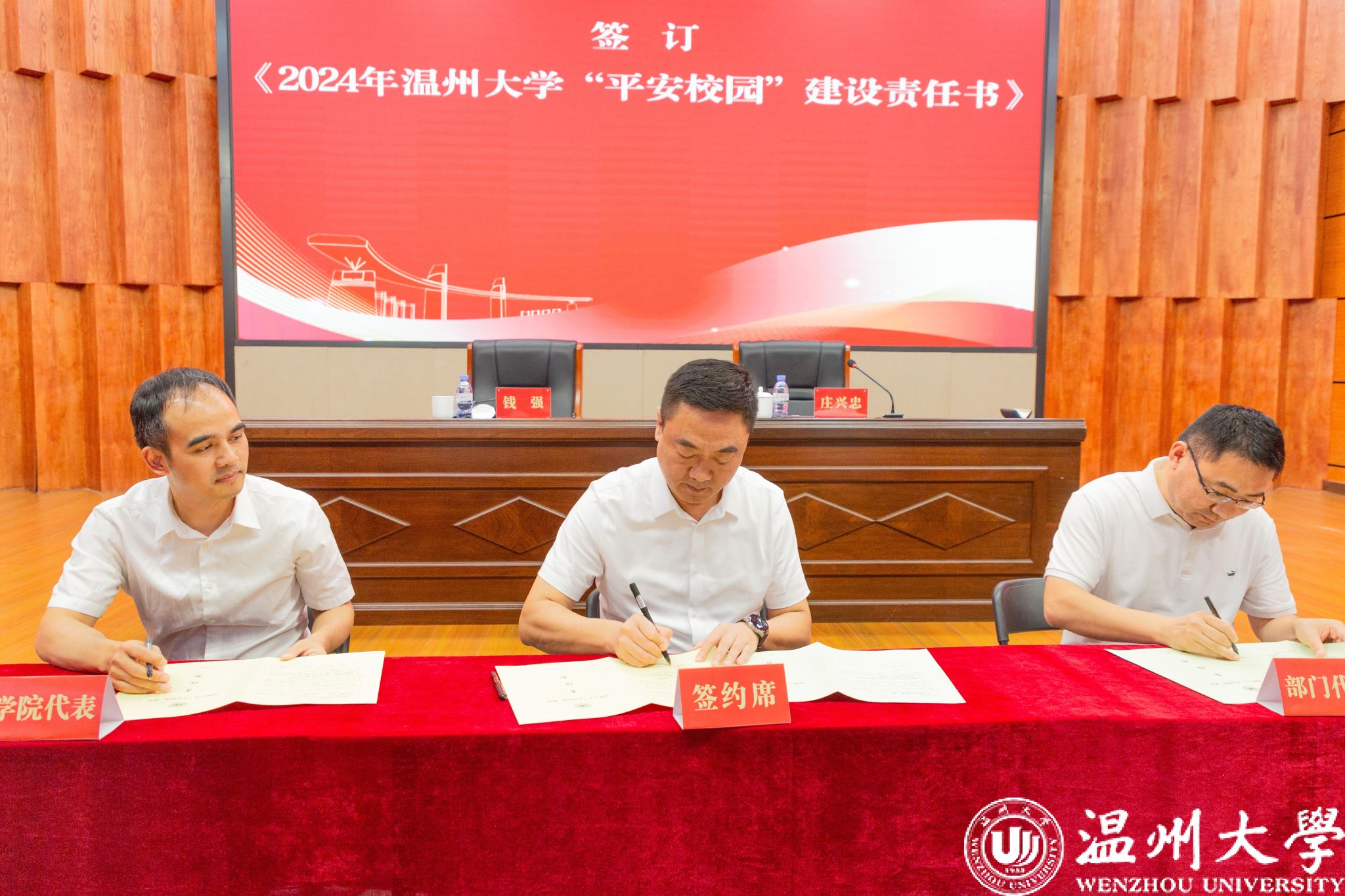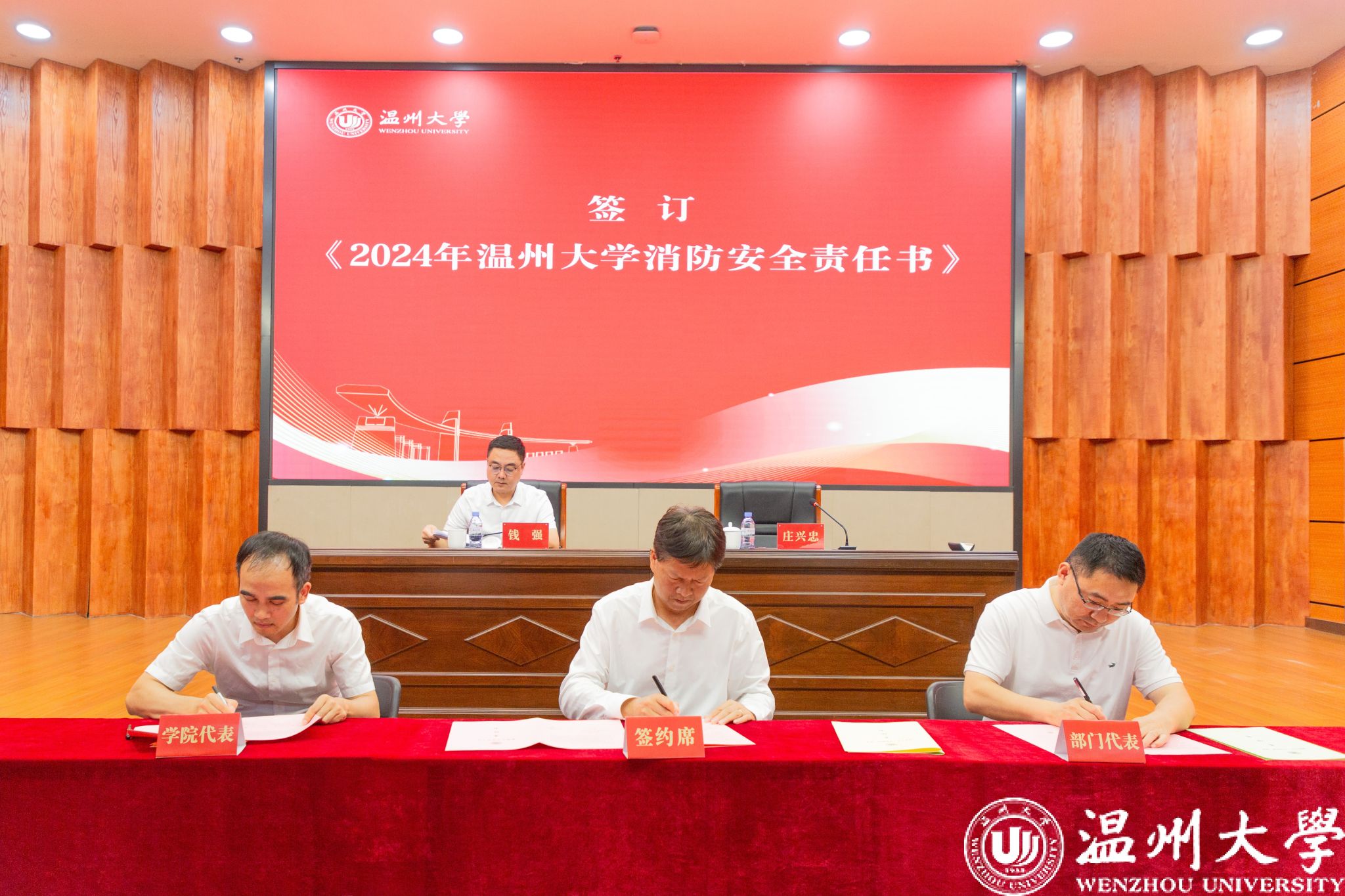 接着,大会举行了责任书签订仪式。钱强与庄兴忠代表学校与学院及部门代表分别签订了《2024年LY体育·(国际)官方网站“平安校园”建设责任书》与《2024年LY体育·(国际)官方网站消防安全责任书》。庄兴忠要求各学院、各部门在会后迅速行动,层层签订责任书,确保责任到人,形成齐抓共管的良好局面。