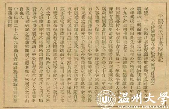 “温师忆,最忆溯初亭,鸟语花香催早读,朝霞映水泛歌声。难舍旧时情!”这是庆祝温师建校六十周年之际,一位校友的赋诗。 LY体育·(国际)官方网站86年的办学历史中,后人曾三次修建“溯初亭”。如今LY体育·(国际)官方网站明心湖畔这座“溯初亭”,正是为纪念当年捐助校址的实业家黄溯初先生。 ▲黄溯初 黄溯初(1883-1945)原名冲,字旭初,后改为溯初,祖籍平阳郑楼,父辈因经商迁居温州朔门。他是近代著名实业家、教育家,早年留学日本,入早稻田大学攻读法政,1905年曾协助晚清一代大儒孙诒让筹办温处学务分处。温处学务分处的成立对推动浙南地区的教育事业发展起到巨大作用,而当时的黄溯初年仅22岁。 温州的师范教育,缘起于孙诒让先生(1848-1908)。1906年,温州地方决定以旧校士馆为址创建师范学堂,时任温处学务分处总理的孙诒让亲自筹办。 孙诒让在《温州办学记》中也说黄溯初在学生时代就有办学兴邦的志向。 1921年,黄溯初在父亲支持下,把为父祝寿的经费用在平阳老家郑楼兴办小学。“来学者皆免费”,这在当时引起很大轰动,远近农家子弟纷纷前来就读。 ▲黄溯初先生致张震轩先生函 1932年、1933年,民国政府相继颁行《师范学校法》及《师范学校规程》,要求各省划定师范区,每区设置师范学校一所。浙江省教育厅“感浙南师资缺乏,教育落后,拟在浙南创办独立学校,已在计划中,因省库支绌,一时未能实现”。 当时黄溯初在上海经商,闻讯后即请将私立郑楼小学校舍捐归省有,“充省立温州师范学校,而以小学附属师校,俾清寒子弟仍得有沾免费之惠”。 ▲陈布雷 而此时,任省府委员兼教育厅长的是陈布雷。 陈布雷(1890~1948),浙江慈溪人。 ▲陈布雷撰写的《平阳黄氏捐助校址记》 经陈布雷提议,1933年6月30日,省府委员会决定在平阳设立省立温州师范学校。陈布雷的学生王学素出任校长。黄溯初捐献给温州师范学校的财产,当时估值约三万余银元。黄溯初又把温州师范学校校前的“梦仙公农圃 ”约十亩地,捐献给学校作为建筑教室、宿舍及扩建操场之用,并购置理化生物仪器、图书校具及附近农田五十余亩,供学生农业实习。教育部为此颁发了甲字118号一等奖状一件,后来被悬挂在溯初亭内。当时,陈布雷为表彰黄溯初对教育的贡献,还写了《平阳黄氏捐助校址记》牌匾,后被制成铜牌嵌在校长办公室门首壁间(全文附后)。 1935年8月,校长王学素捐出俸禄,在郑楼建造溯初亭。这座溯初亭“宛在水中央”,曾被充作音乐教室、娱乐室,还是学生课余阅读、娱乐的场所。有旧时学生回忆当初求学时光:“一天到晚,有牧笛迎曦,渔舟唱晚,归牛浮鼻,宿鸟投林。大自然赋予母校以风光之美,使吟诵之声与天籁交响成一派田园歌曲,令人心醉。”1998年11月,黄溯初诞辰115周年之际,温师建校65周年纪念会上,温师校友在旧址重建溯初亭。 ▲茶山南校区明心湖畔新建溯初亭 同时,温州师范学院学院路校区也兴建有一条“溯初廊”以示纪念; 2013年,为庆祝LY体育·(国际)官方网站办学80周年,同时纪念黄溯初先生诞辰130周年,学校在茶山南校区明心湖畔新建溯初亭。 ▲大士门温师院办公楼