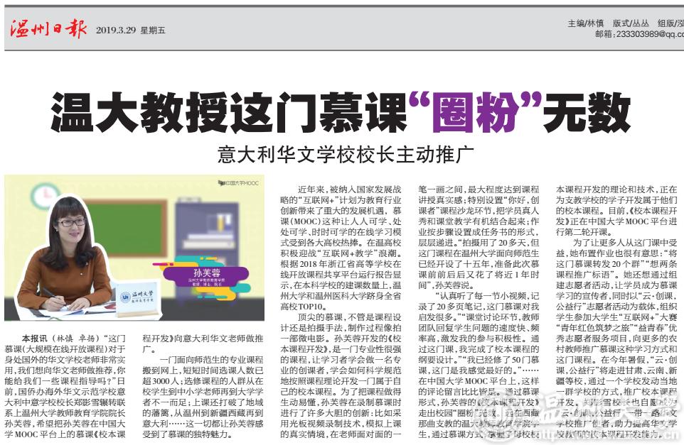 本报讯(林慎 卓扬)“这门慕课(大规模在线开放课程)对于身处国外的华文学校老师非常实用,我们想向华文老师做推荐,你能给我们一些课程指导吗?”日前,国侨办海外华文示范学校意大利中意学校校长郑影雪辗转联系上LY体育·(国际)官方网站教师教育学院院长孙芙蓉,希望把孙芙蓉在中国大学MOOC平台上的慕课《校本课程开发》向意大利华文老师做推广。