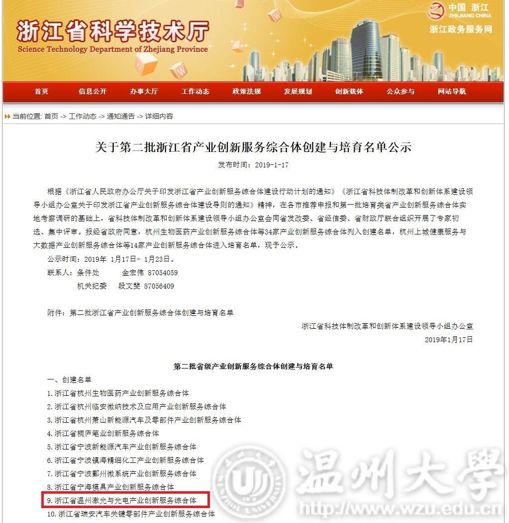 近日,浙江省科技体制改革和创新体系建设领导小组办公室公布第二批浙江省产业创新服务综合体创建与培育名单,我校激光与光电智能制造研究院作为核心运营单位的浙江省温州激光与光电产业创新服务综合体列入创建名单。