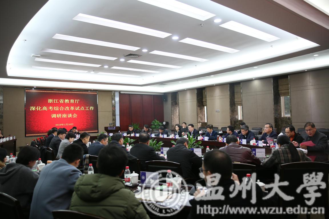 1月10日下午,浙江省深化高考综合改革试点工作调研座谈会在我校举行,会议全面总结我省在深化高考改革试点过程中取得的成效、出现的问题,并向与会专家征求建议和改进措施,进一步完善我省高考综合改革试点工作。副市长郑朝阳、校长赵敏、浙江中、南片区13所高校负责教学或招生工作的校领导、相关部门负责人及教育专家、师生代表共50余人参加会议。省教育厅副厅长于永明主持会议。