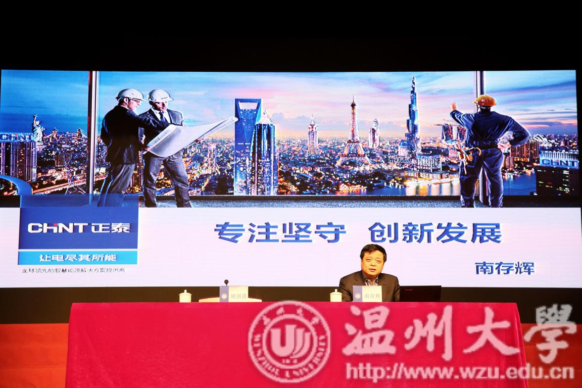 1月9日,“改革先锋进校园”浙江温州专场活动在我校举行。“温州民营经济的优秀代表”、正泰集团股份有限公司董事长、“改革先锋”南存辉以“专注坚守,创新发展”为题,与现场1000多名在温高校的师生代表畅谈改革开放以来正泰的创业创新之路。