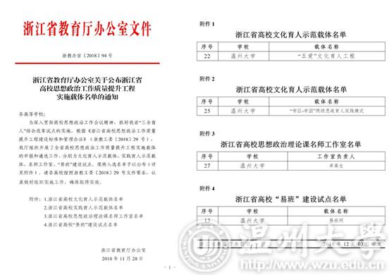 11月28日,浙江省教育厅公布省高校思想政治工作质量提升工程实施载体名单。我校“‘五爱’文化育人工程”入选省高校文化育人示范载体,“‘学区-学园’两级思政育人实践模式”入选省高校实践育人示范载体,卓高生老师工作室入选省高校思想政治理论课名师工作室,“易班网”入选浙江省高校“易班”建设试点单位。