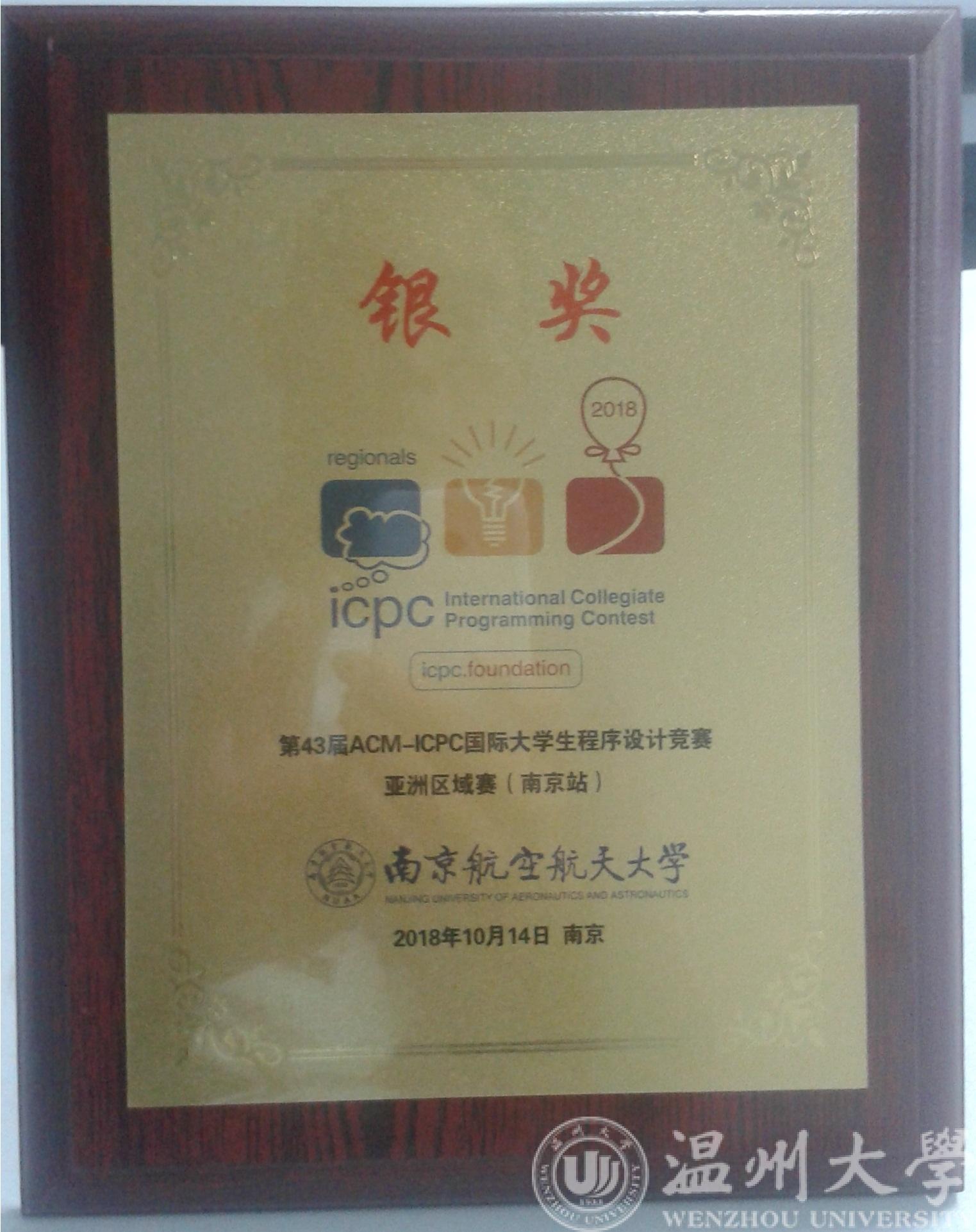 10月14日我校阿尔法队在第43届国际大学生程序设计竞赛亚洲区域赛(ACM-ICPC)南京站上摘得银奖,创造我校在该项赛事上的历史最好成绩。我校参赛的阿尔法队由数电学院16计本1班学生钟庭彪、孙铤超和李克炼组成,教练是胡明晓老师。
