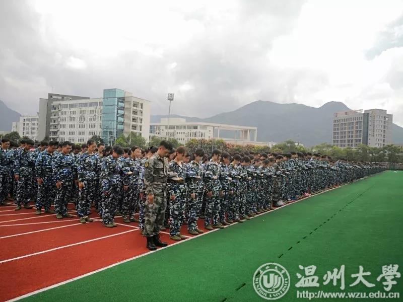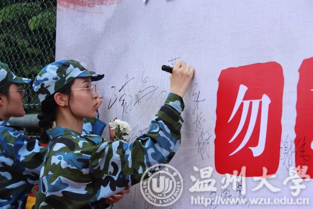 南校区运动场,超豪学区和步青学区的全体2018级军训新生以及教工党员,举行“九一八”纪念活动。10:20分,防空警报拉响,全体老师、教官、军训学生脱帽默哀,向在“九一八”事变中牺牲的同胞和革命先烈深切悼念,并在签名墙上签名留念。