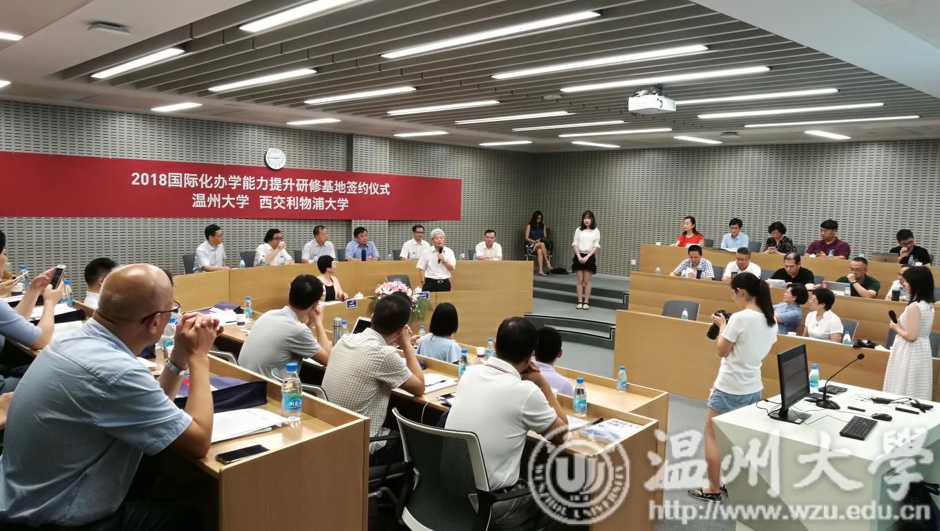 林娟娟讲话。她指出,举办国际化办学能力提升培训班,是我校贯彻落实好党的十九大提出的深化教育改革、推动国际化战略落地的具体举措。广大学员一是要提高认识,深刻领会此次国际化办学能力提升培训的意义。要对标先进查找我校和国际一流大学的差距在哪里,然后大胆吸收、借鉴国际先进的人才培养与学术科研经验。二是要把握主题,充分学好用好西交利物浦大学的先进理念和经验。西交利物浦大学以研究导向、独具特色、世界认可的中国大学和中国土地上的国际大学为其办学理念,在办学国际化上实施目标、机制和要素三个层次的国际化体系,深受业界的好评。广大学员要以“自我革命”的精神,向西交利物浦大学学习“以学生为中心”理念,积极开展国际化办学提升的思考和实践。三是要端正态度、严守纪律,以普通学员的身份全身心地投入到学习中去,做到学有所思、学有所得,确保此次国际化培训的各项任务圆满完成。