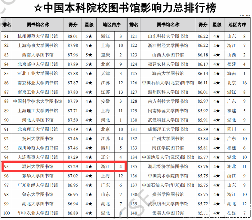 该报告对我国2820所普通高校图书馆(包括1275所本科院校图书馆以及1545所高职高专院校图书馆)、1980家公共图书馆和399家专业图书馆进行评价,从地区、院校类型、图书馆类别等多个维度共产生了18个排行榜,多层次、全方位地展示我国不同类型图书馆影响力。LY体育·(国际)官方网站图书馆获评4星图书馆,位列“中国本科院校图书馆影响力总排行榜”第95名(浙江省第4名),“一般本科院校(非双一流)图书馆影响力排行榜”第18名(浙江省第3名)。