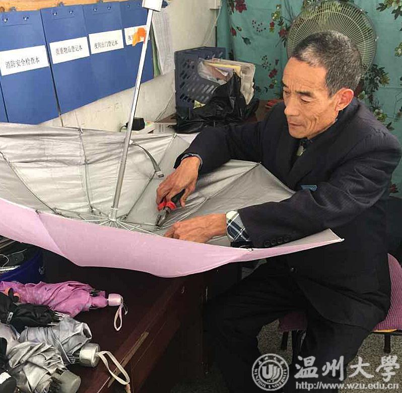 作为一名宿舍管理员,田老伯无时无刻不在发挥着自己身上的能量,温暖每一位同学。过过苦日子的他深知生活不易,因此他总是尽自己所能帮助同学们节省开支、减轻负担。田老伯注意到,不少同学把只有一点小毛病的伞丢弃了,觉得很可惜,于是他把那些被丢弃的雨伞收集起来,自己动手进行修理。不久之后,他在值班室门口竖起了一块牌子,上面写着“爱心修伞,不收费”。此后,越来越多的师生把旧伞送到他那里维修,仅仅一年,田老伯就为学校师生维修雨伞400余把,不但节省了一万多元的开支,还倡导了节俭的风尚。