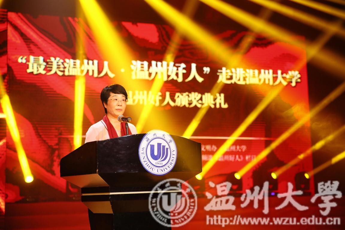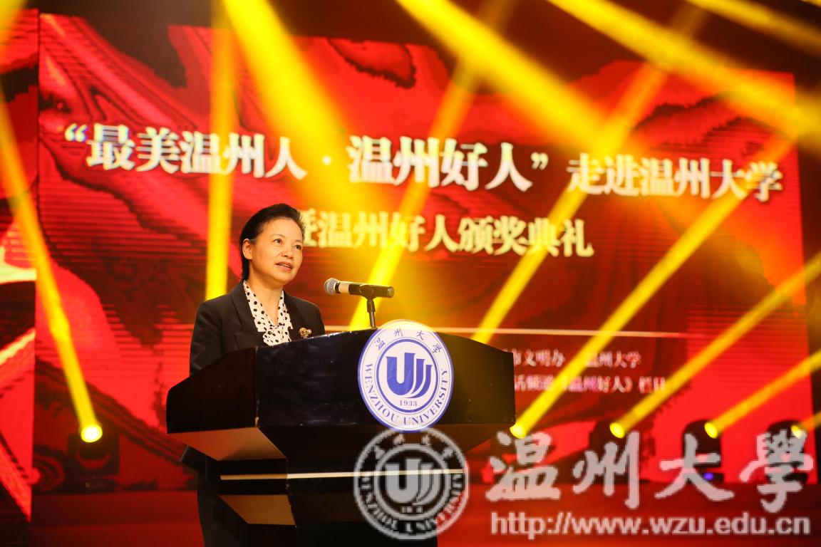 “温州是温暖之城是全国文明城市,‘大爱’是温州的标志。”校党委书记林娟娟致辞,她说,学校办学八十五年来,一代代温大人始终秉持“光大国族 造福人群”的精神,生动诠释着社会主义核心价值观,展现温大人崇高的责任担当与深切的大爱情怀。林娟娟指出,进入新时代迈开新征程,践行社会主义核心价值观弘扬主旋律是时代赋予青年学子的责任和当担。她表示,学校将以“爱温州,做温州好人”的主人翁姿态,积极主动参与温州全国文明城市建设;以“温州好人”进温大活动为契机,进一步把温州好人的模范事迹推向广大师生学习,进一步将校园志愿者活动做强做大。