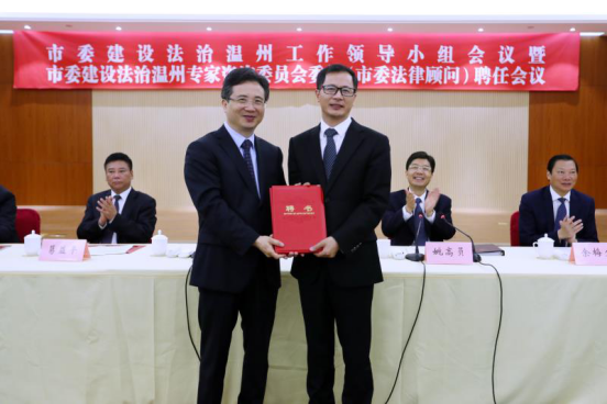 市委副书记、市长姚高员主持会议,省委常委、市委书记周江勇,市人大常委会主任葛益平,市政协主席余梅生等出席会议,我校副校长方益权教授、法政学院院长王宗正教授及复旦大学孙笑侠教授等21人被聘为市委建设法治温州专家咨询委员会委员,方益权、王宗正等5人被聘为市委法律顾问,周江勇为市委建设法治温州专家咨询委员会委员与市委法律顾问颁发聘书。