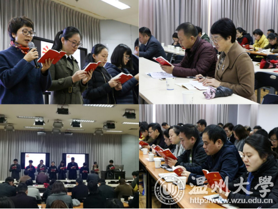 会上,全体人员齐读党章。机关党委第一党总支全体党员一并参与学习。校党委书记林娟娟,校党委副书记牟德刚,校党委委员、纪委书记吴金法以普通党员身份参加专题学习。