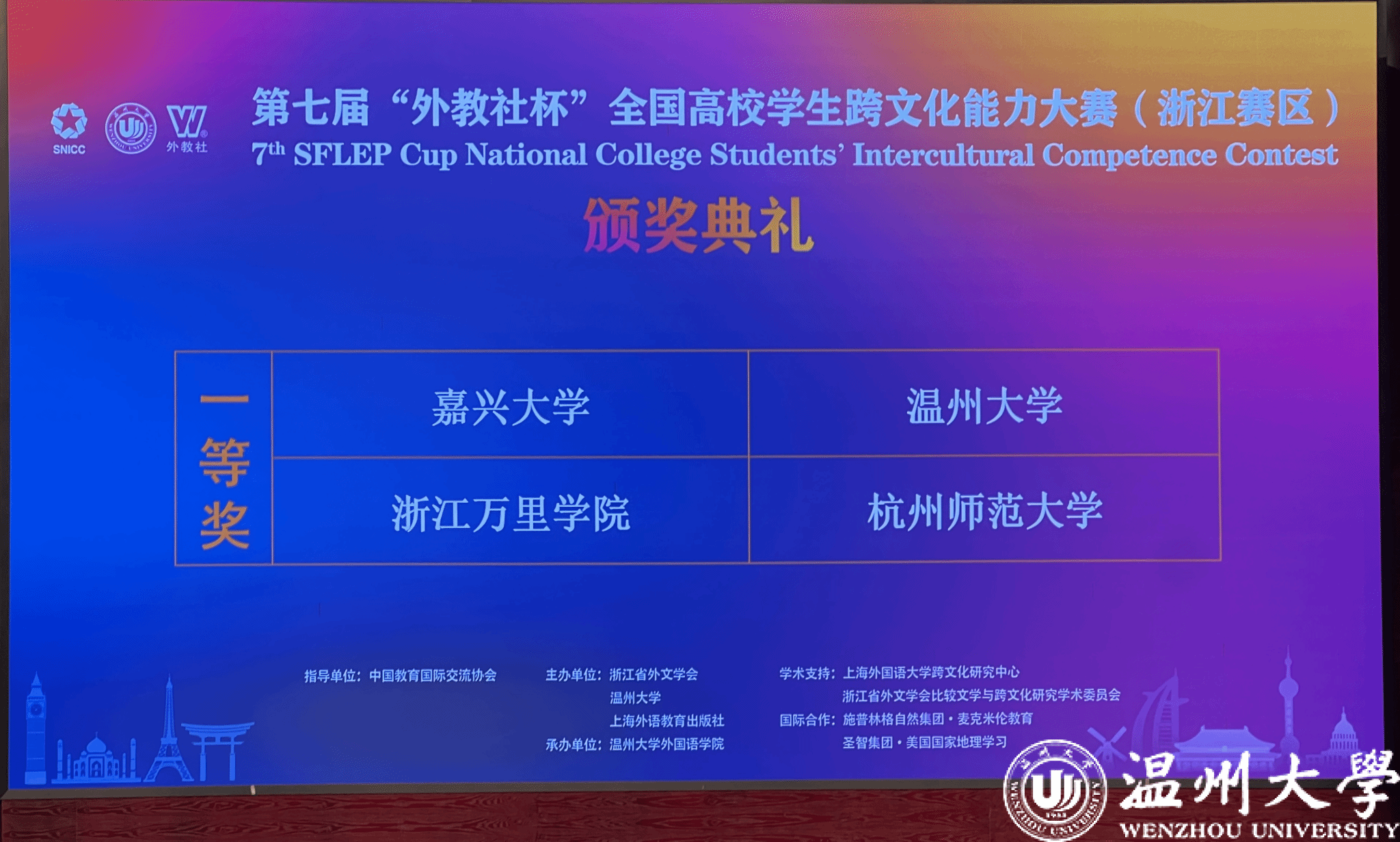 11月16-17日,第七届“外教社杯”全国高校学生跨文化能力大赛(浙江赛区)复赛/决赛在LY体育·(国际)官方网站成功举办。该赛事由浙江省外文协会、LY体育·(国际)官方网站和上海外语教育出版社联合主办,LY体育·(国际)官方网站外国语学院承办。经过2天的激烈角逐,LY体育·(国际)官方网站代表队不辱使命,成功夺得“一等奖”。