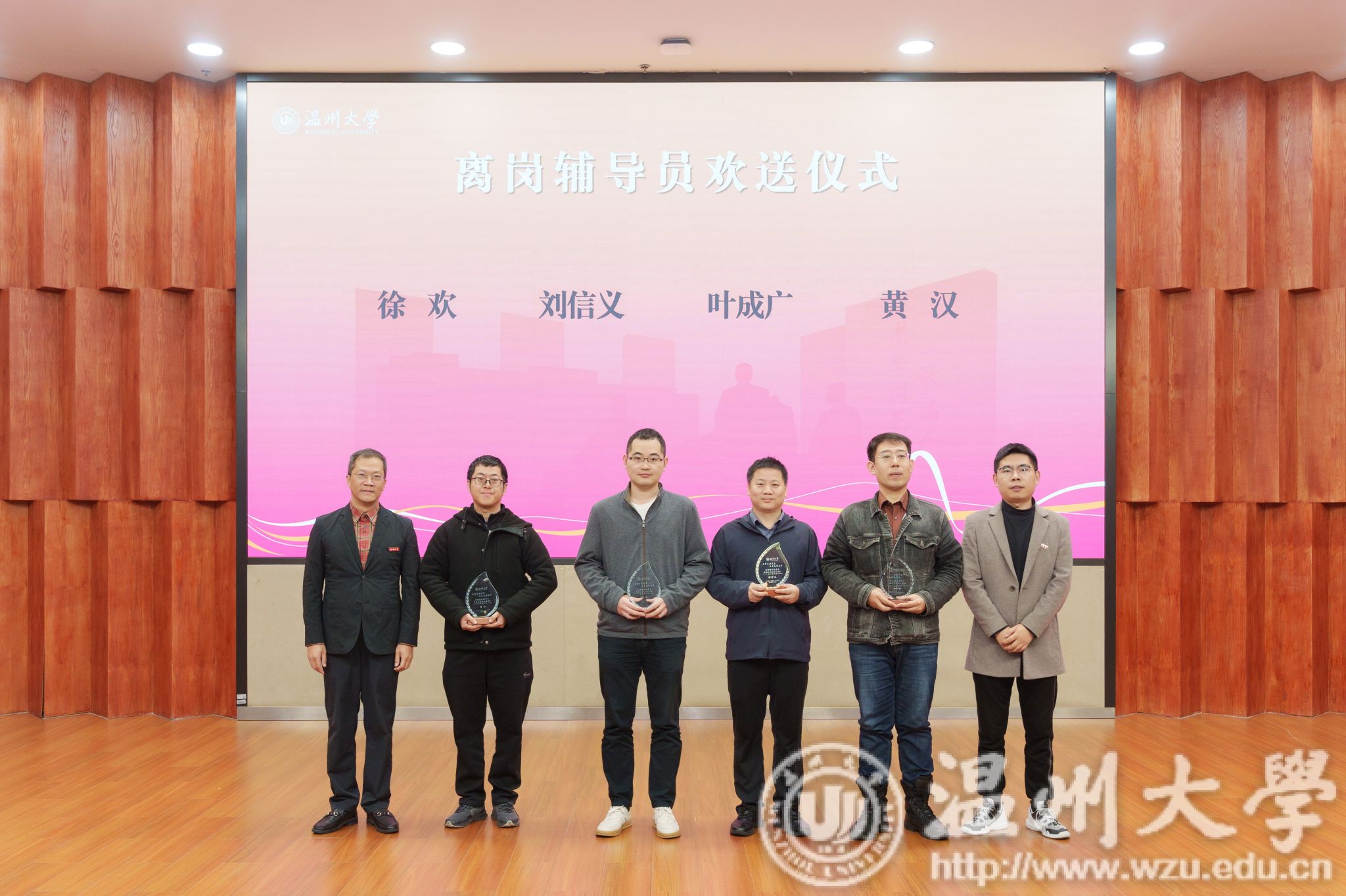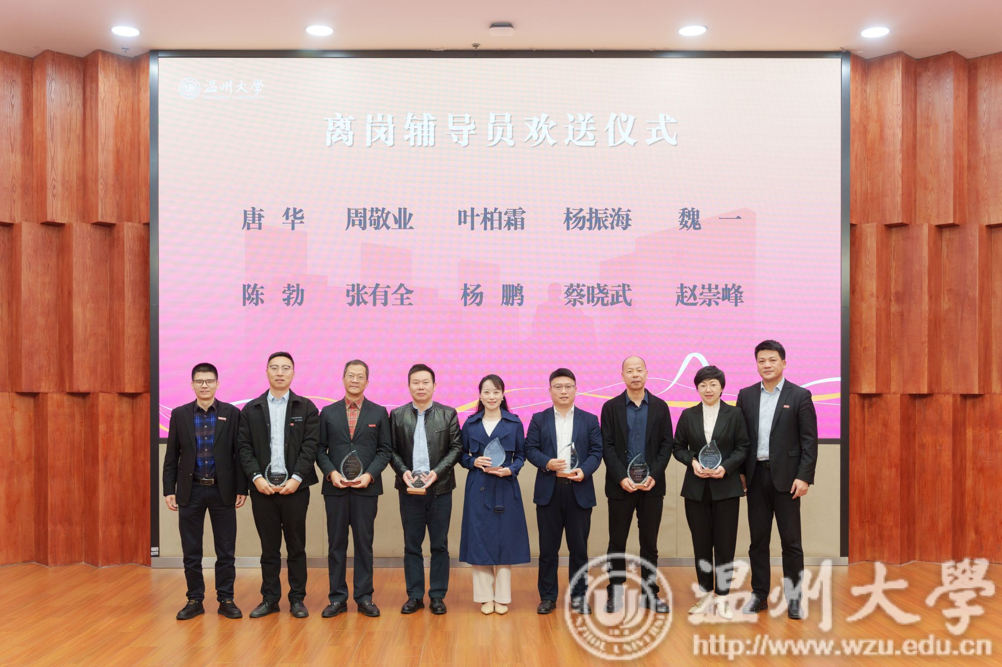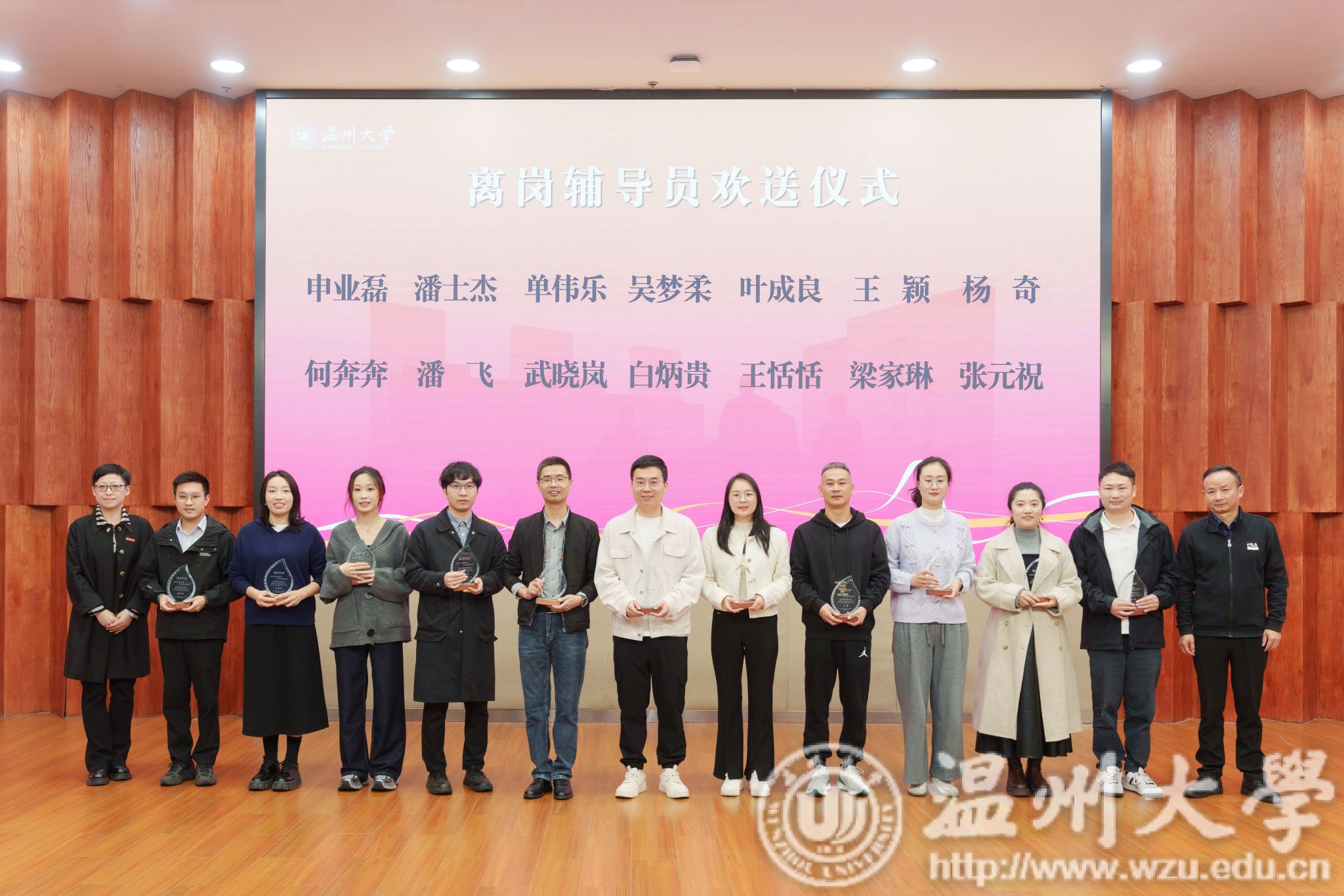 离岗辅导员欢送仪式环节,校学生工作委员会委员为离岗辅导员颁发纪念奖杯。离岗辅导员梁家琳作为代表发言,深情回顾了自己的辅导员生涯,表达了对新入职辅导员的期望和祝福。