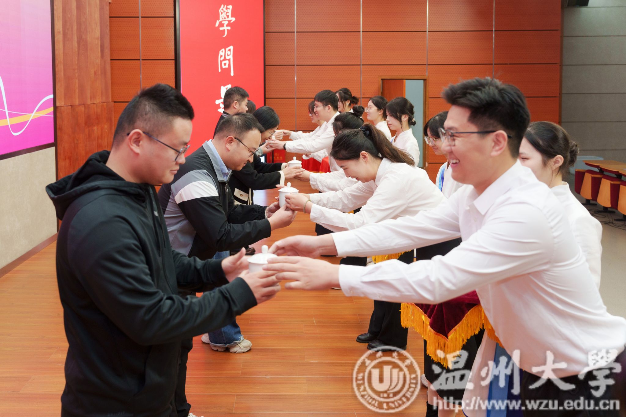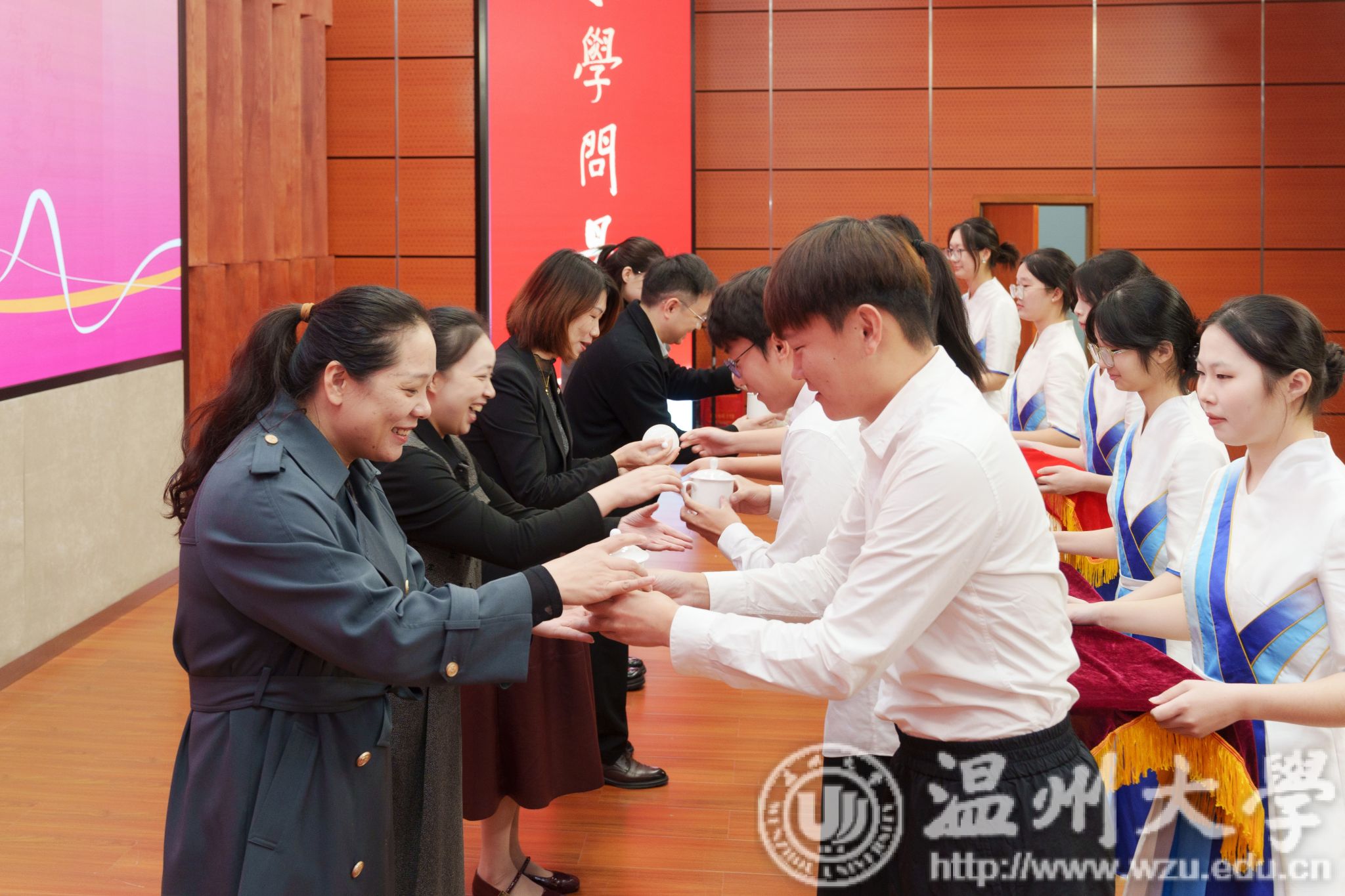 “青蓝引航工程·师徒结对仪式”中,新入职辅导员向前辈行敬茶礼正式拜师,彰显了师徒间深厚的情谊,体现了辅导员队伍中宝贵的传承精神。