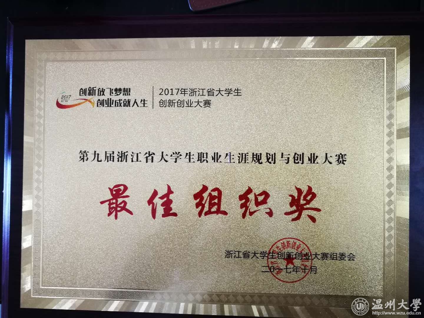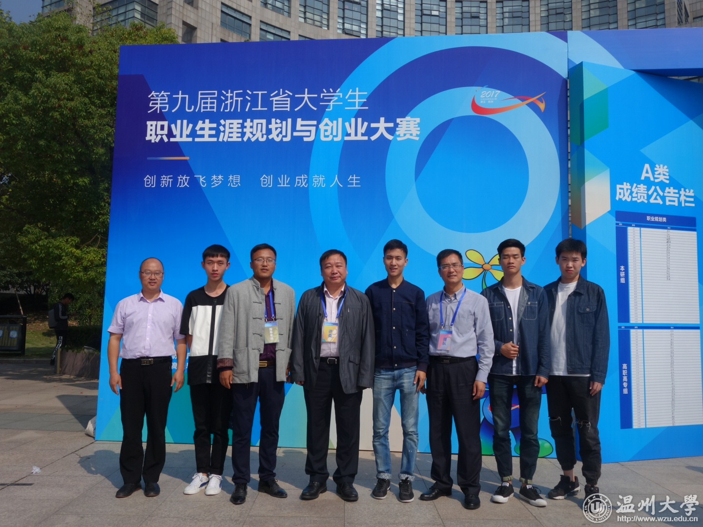 浙江省职业规划与创业大赛是省一级学科竞赛。大赛2017年4月启动, 全省102所高校2.1万大学生参加本次赛事, 640个项目进入省级复赛,最后 162个项目进入总决赛。其中,我校法政学院郑荣权同学参赛项目《在黑暗中追逐光明》以总分第一的成绩获得职业规划类一等奖,并荣获“2017年浙江省最佳职业规划之星”称号;教师教育学院周群慧团队参赛项目《知心童行》以总分第一的成绩获得创业实践类一等奖;机电工程学院屠佳炜团队参赛项目《银装数果》以总分第二的成绩获得创新创意类一等奖;物理与电子信息工程学院陈铮团队参赛项目《温州唐天娱乐传媒有限公司》获得创业实践类一等奖;建筑工程学院杨璐团队参赛项目《精细化三轴试验配套装置研发与推广》获得创新创意类二等奖。孙德升、严晓秋、姜锐、林爱菊、彭小媚等11名老师荣获“浙江省第九届大学生职业生涯规划与创业大赛优秀指导师”称号。