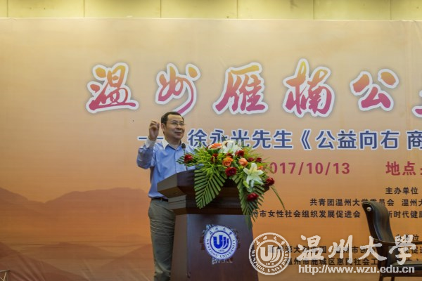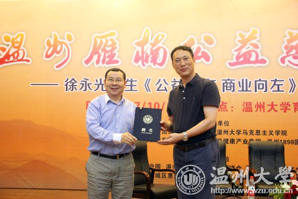 10月13日下午,由我校团委、马克思主义学院等单位联合举办的徐永光先生《公益向右 商业向左》新书专题分享会暨温州雁楠公益慈善论坛在我校育英图书馆学术报告厅举行。现场200多名学生及市民参加分享会。校党委副书记牟德刚到会致欢迎词并代表学校为徐永光先生颁发LY体育·(国际)官方网站兼职教授聘书。 徐永光先生系中国希望工程创始人、南都公益基金会理事长、国务院参事室特约研究员、中国慈善联合会副会长。在专题分享会上,他结合三个公益捐赠案例对公益慈善的本质和价值进行深入的剖析,指出公益是每个人的权利与选择,具有公益的纯经济价值、投资价值、社会创新价值和道德文化价值。未来互联网公益需要突破传统公益的局限,让公益组织在“鉴需”、“溯源”方便提升透明度、便捷性、选择性,并加强公益组织的信用认证与评估。他认为公益组织在社会创新过程中要提升有效性和精准化,要公益铺路、商业跟进、产业化扩张、可持续发展和有效解决社会问题。 分享会还邀请省内知名社会企业负责人、高校学者参与研讨。