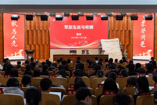在讲座后半段,黄宏将军与师生分享了他的收藏人生。他以一己之力,收藏了三万余件珍贵藏品,在全国举办过30余场大型展览。对于收藏,他形容道:“收藏已经成为我生活的一部分。”然而,他并未将收藏仅视为个人兴趣,而是致力于将其转化为社会文化建设的重要组成部分。他将部分藏品捐赠展馆,供专家研究、群众学习,以推动中华优秀传统文化的传播与传承。
