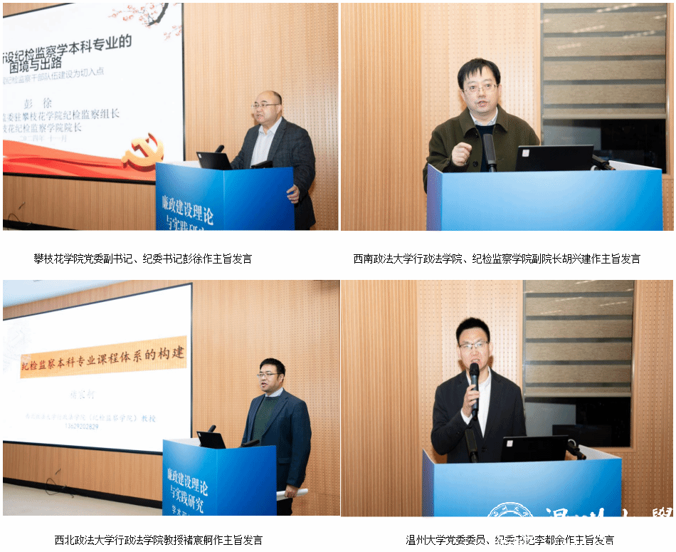 会上,四川省纪委监委派驻攀枝花学院纪检组长、攀枝花学院党委副书记、纪委书记、攀枝花纪检监察学院院长彭徐作《地方高校新设纪检监察学专业的困境与出路——以基层纪检监察干部队伍建设为切入点》主旨发言。西南政法大学行政法学院、纪检监察学院副院长胡兴建教授作《正确处理政治与法治的关系,推进纪检监察学学科建设》主旨发言。西北政法大学行政法学院、纪检监察学院教授、监察法学学科带头人褚宸舸作《纪检监察本科专业课程体系的建构》主旨发言。LY体育·(国际)官方网站党委委员、纪委书记、省监委驻温大监察专员李都金作《习近平法治思想与纪检监察工作“三个效果”有机统一研究》主旨发言。